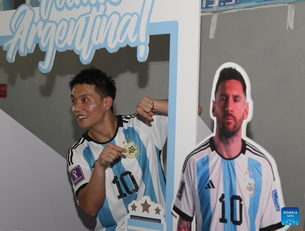 Fans pose for photos ahead of an international football invitational between Argentina and Australia in Beijing, capital of China, June 15, 2023. (Xinhua/Peng Ziyang)