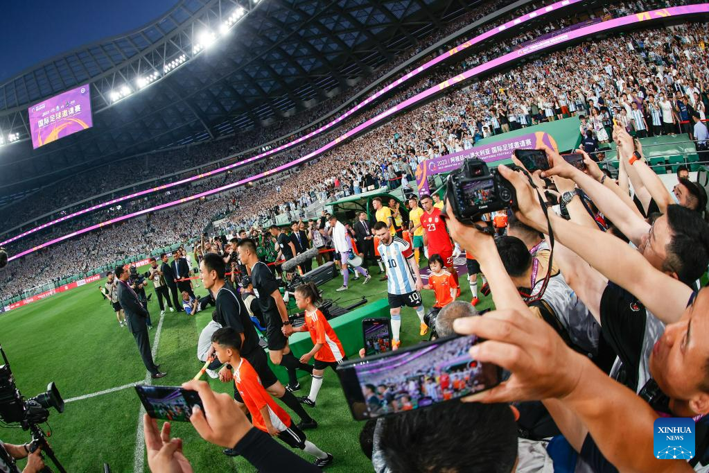 Players compete during an international football invitational between Argentina and Australia in Beijing, capital of China, June 15, 2023. (Xinhua/Wang Lili)