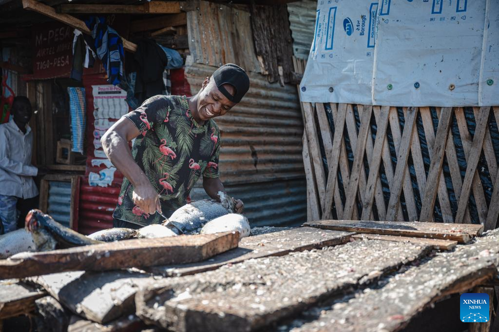 A villager removes fish scales on the shore of Lake Victoria in Mwanza region, Tanzania on June 11, 2023. Lake Victoria, located in the Great Rift Valley of East Africa, is the largest freshwater lake in Africa and the second largest freshwater lake in the world. Fishery is the main industry in the lake area, with an annual output value of 600 million U.S. dollars. It is an essential source of food and income for the residents along the lake. (Xinhua/Wang Guansen)
