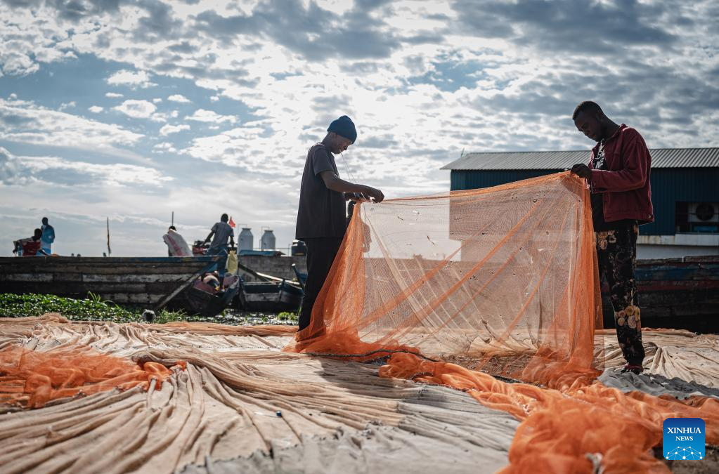 Fishermen prepare a fishing net on the shore of Lake Victoria in Mwanza region, Tanzania on June 10, 2023. Lake Victoria, located in the Great Rift Valley of East Africa, is the largest freshwater lake in Africa and the second largest freshwater lake in the world. Fishery is the main industry in the lake area, with an annual output value of 600 million U.S. dollars. It is an essential source of food and income for the residents along the lake. (Xinhua/Wang Guansen)