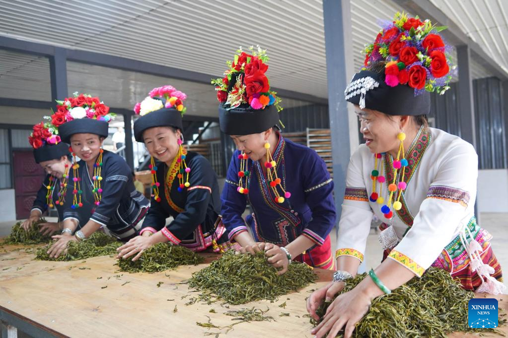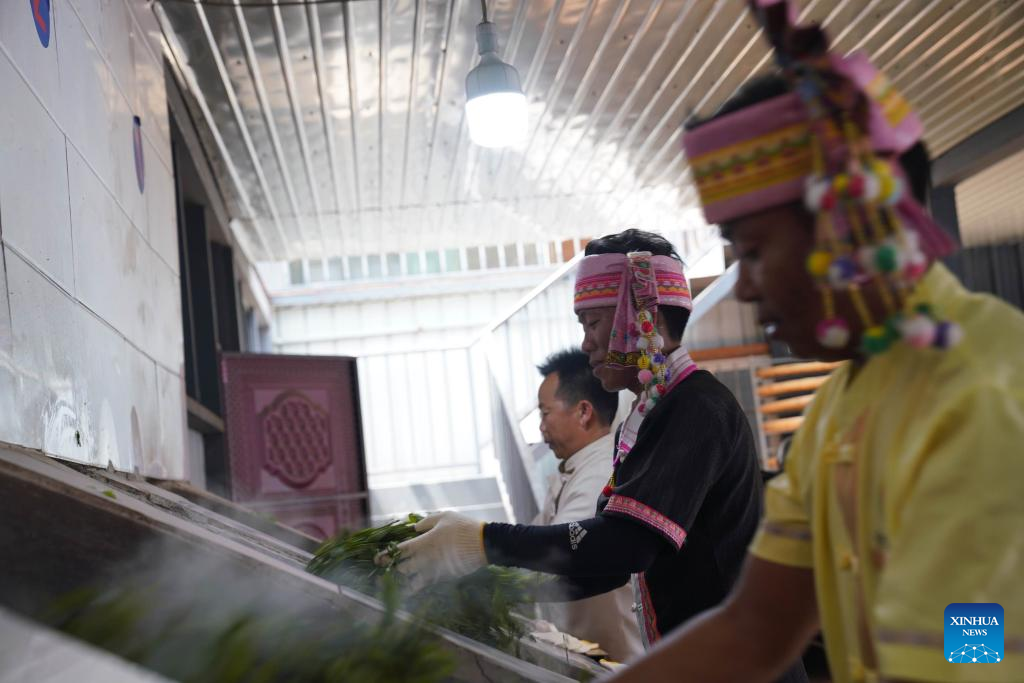 Villagers process tea leaves in Old Man'e Village, Menghai County, southwest China's Yunnan Province, June 7, 2023. (Xinhua/Geng Huihuang)
