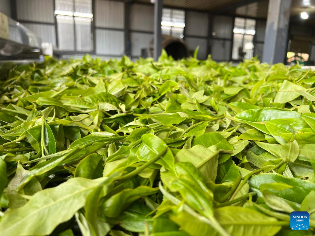 This photo taken on June 7, 2023 shows tea leaves being air-dried in Old Man'e Village, Menghai County, southwest China's Yunnan Province. (Xinhua/Zhuang Beining)