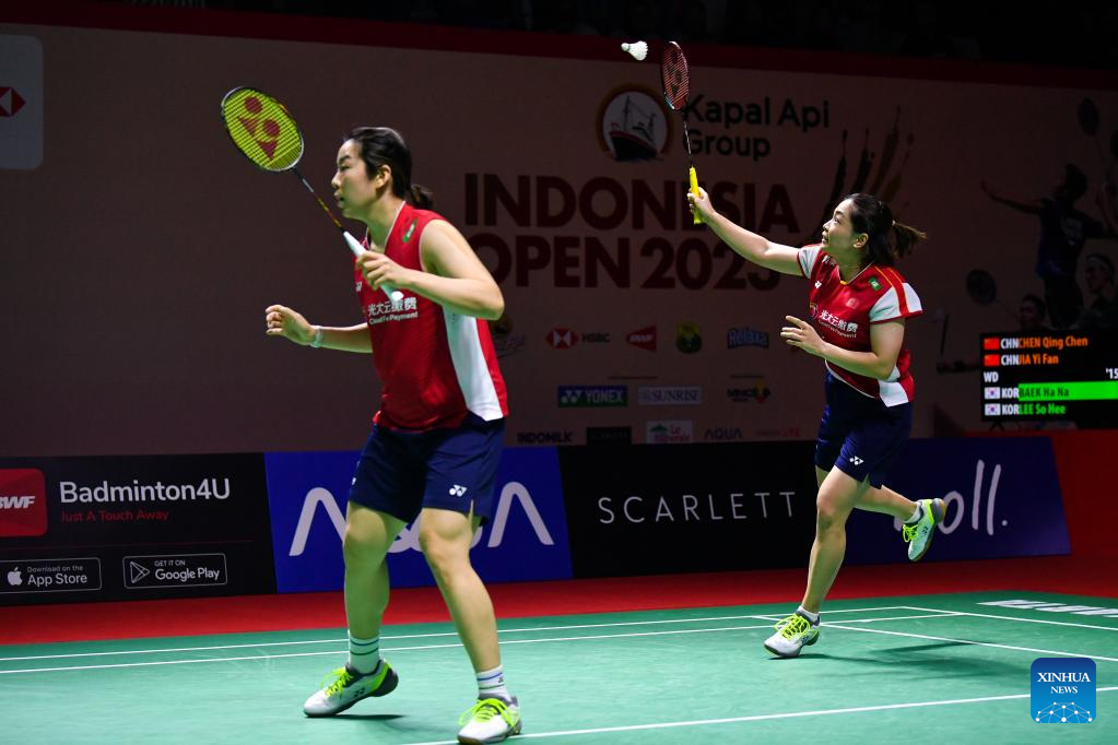 China's Chen Qingchen (R)/Jia Yifan compete during the women's doubles quarter final match against South Korea's Baek Ha Na/Lee So Hee at Indonesia Open 2023 in Jakarta, Indonesia, June 16, 2023. (Xinhua/Xu Qin)