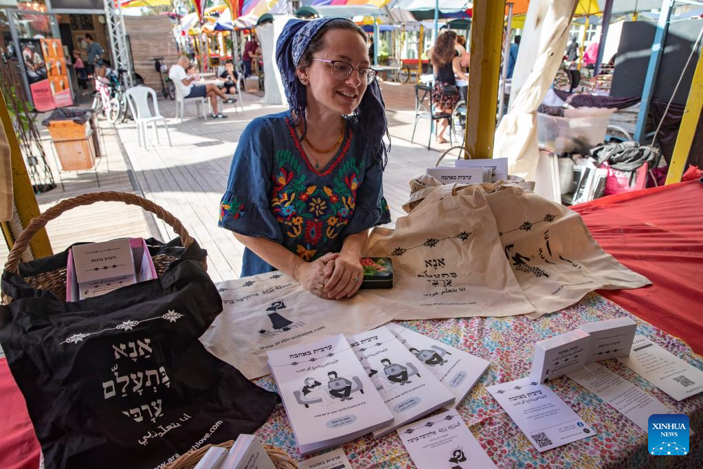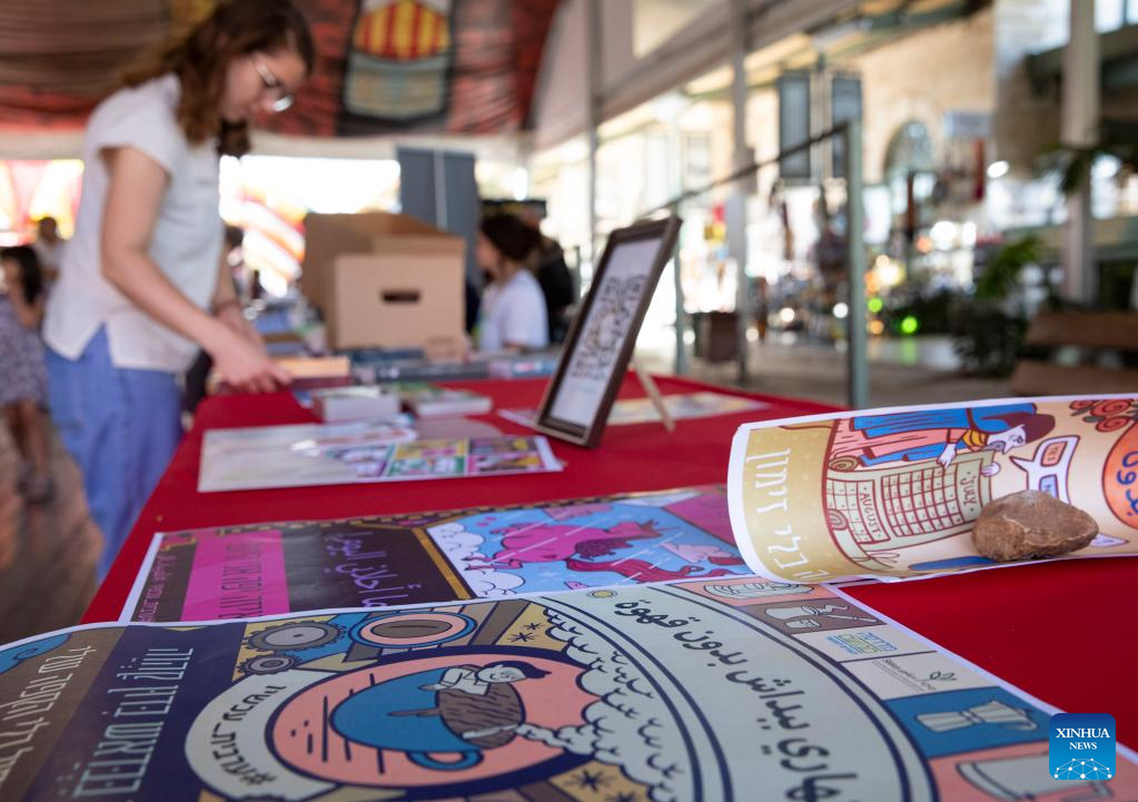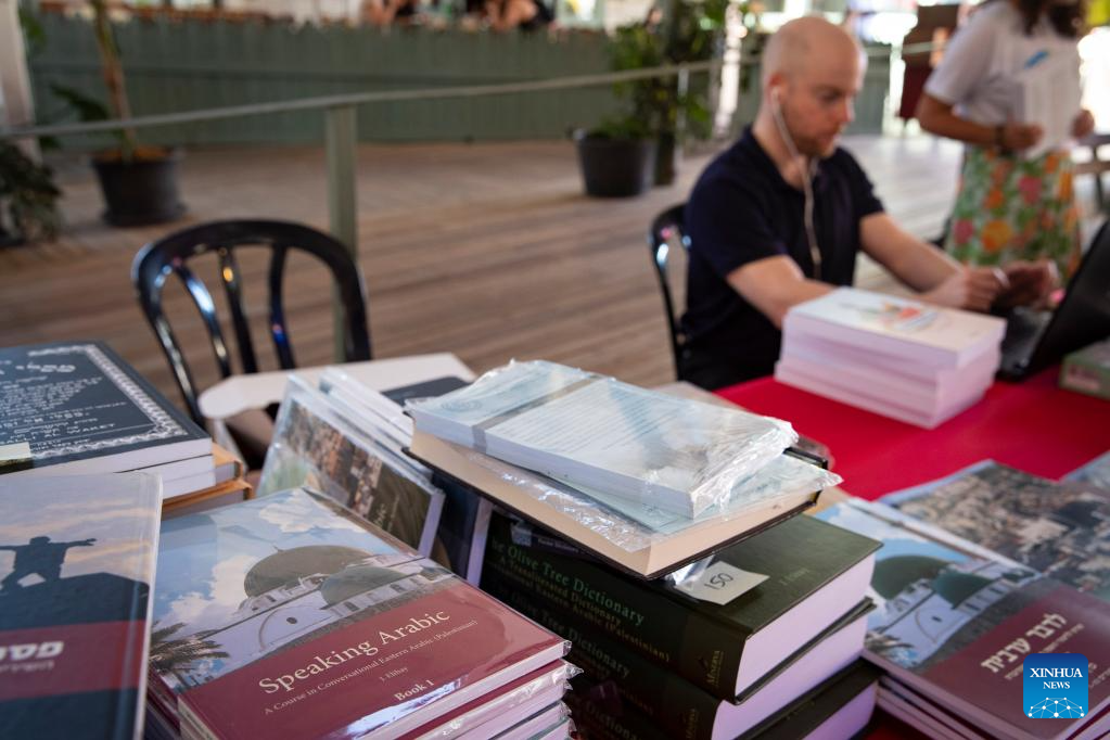 This photo taken on June 15, 2023 shows a book stall during the Arabic Language and Culture Festival in Jerusalem. The Arabic Language and Culture Festival, including offline Arabic courses, an Arabic book fair, interlingual communication programs and Arabic film screenings, opened in Jerusalem on Thursday. (Xinhua/Chen Junqing)