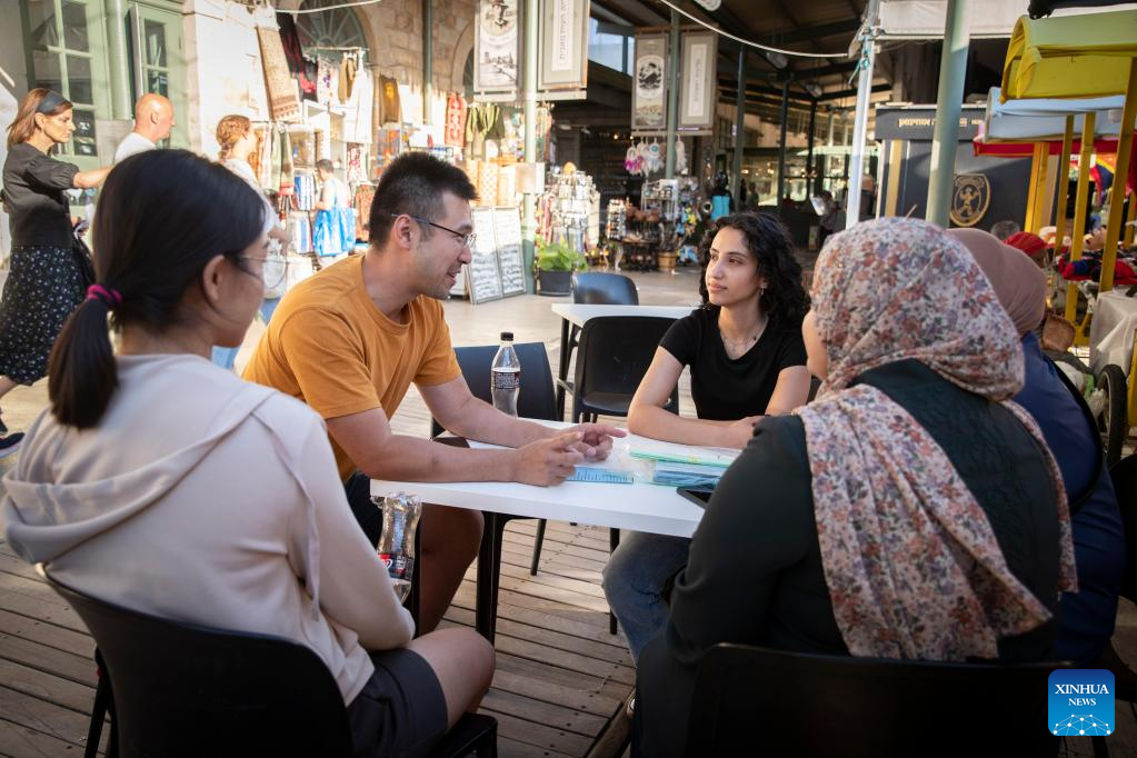 People take part in an interlingual communication program during the Arabic Language and Culture Festival in Jerusalem, June 15, 2023. The Arabic Language and Culture Festival, including offline Arabic courses, an Arabic book fair, interlingual communication programs and Arabic film screenings, opened in Jerusalem on Thursday. (Xinhua/Chen Junqing)