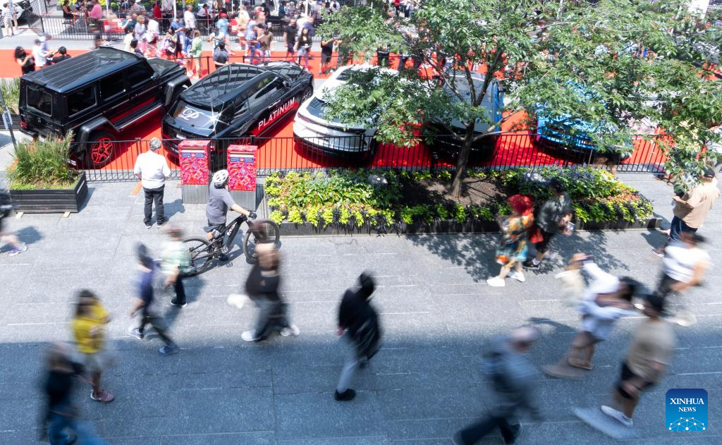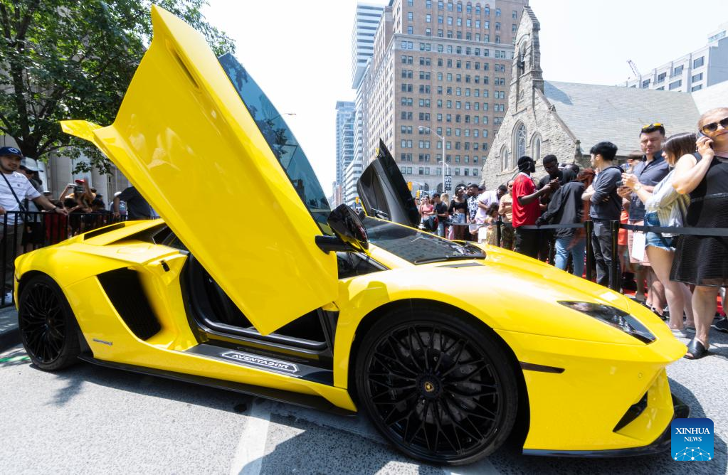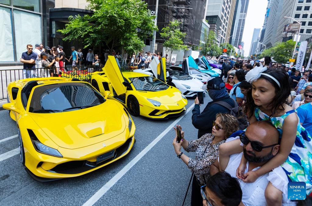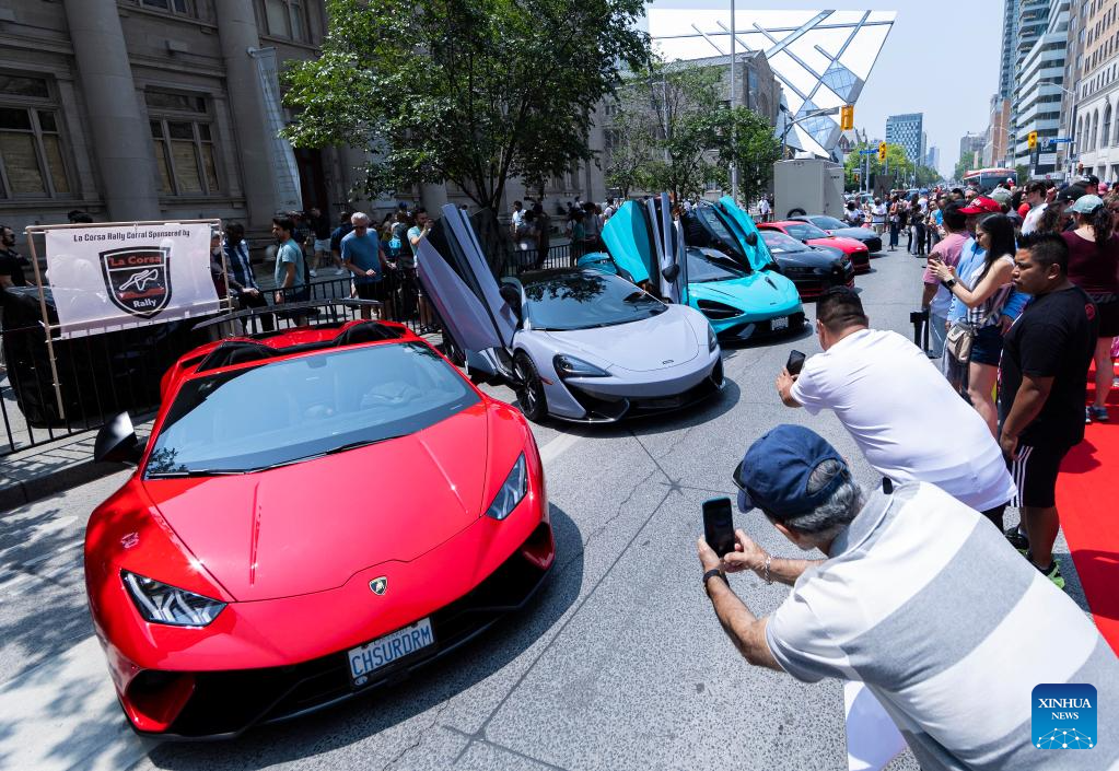 People visit the 2023 Yorkville Exotic Car Show in Toronto, Canada, on June 18, 2023. The annual event was held here on Sunday to celebrate Father's Day with about 100 cars on display. (Photo by Zou Zheng/Xinhua)