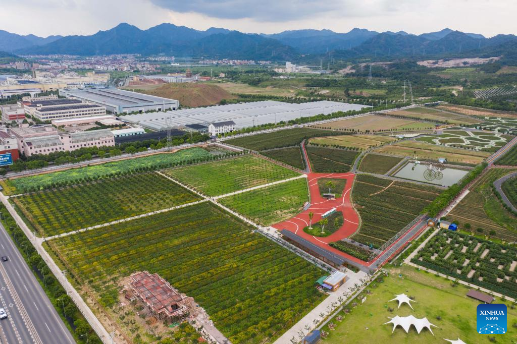This aerial photo taken on June 19, 2023 shows an agricultural ecological park in Huayuan Village of Nanma Town, Dongyang City, east China's Zhejiang Province.