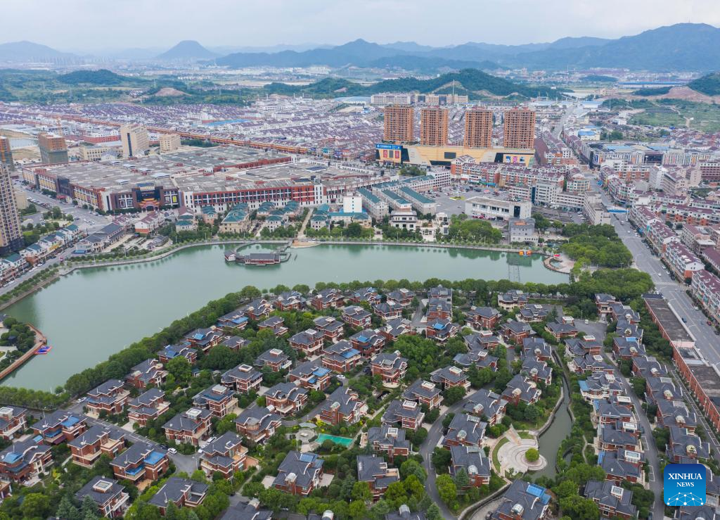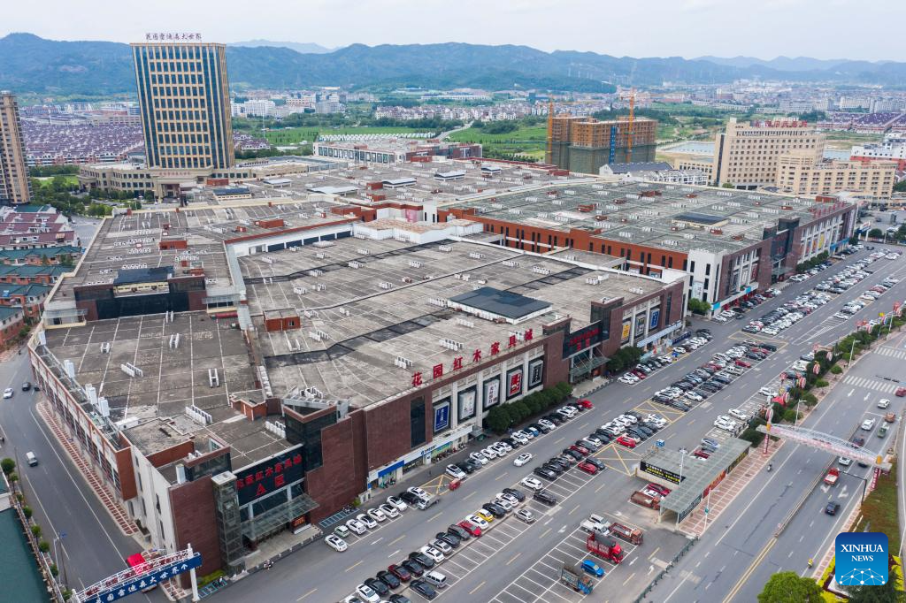 This aerial photo taken on June 19, 2023 shows a mahogany furniture market in Huayuan Village of Nanma Town, Dongyang City, east China's Zhejiang Province.