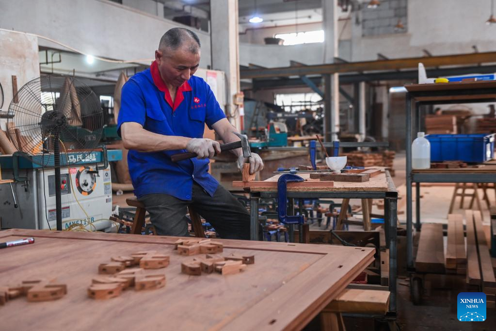 An employee works at a furniture plant in Huayuan Village of Nanma Town, Dongyang City, east China's Zhejiang Province, June 19, 2023.