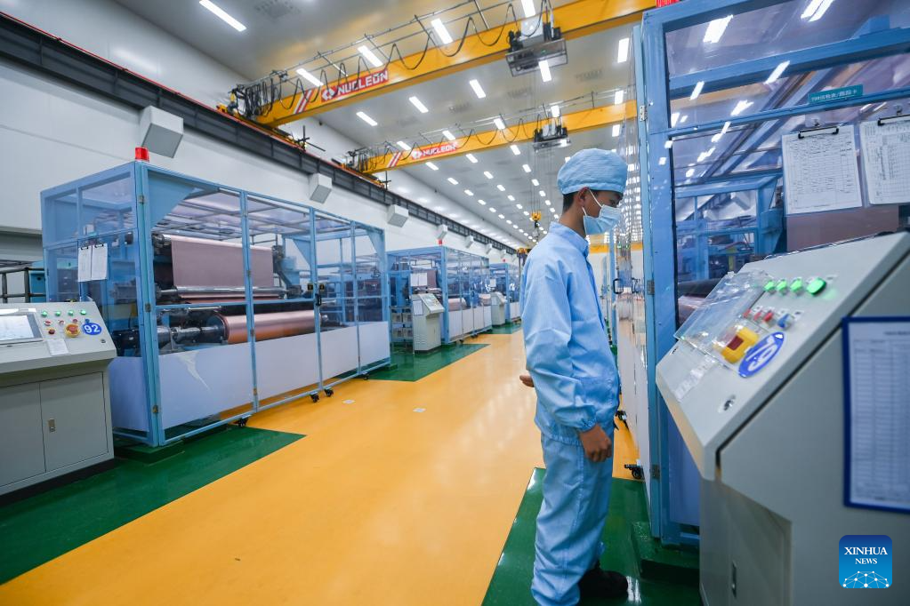 An employee works at a workshop of a new energy company in Huayuan Village of Nanma Town, Dongyang City, east China's Zhejiang Province, June 19, 2023.