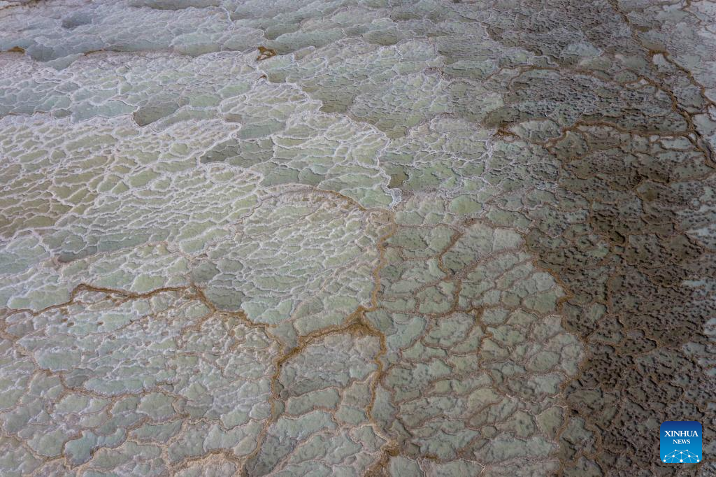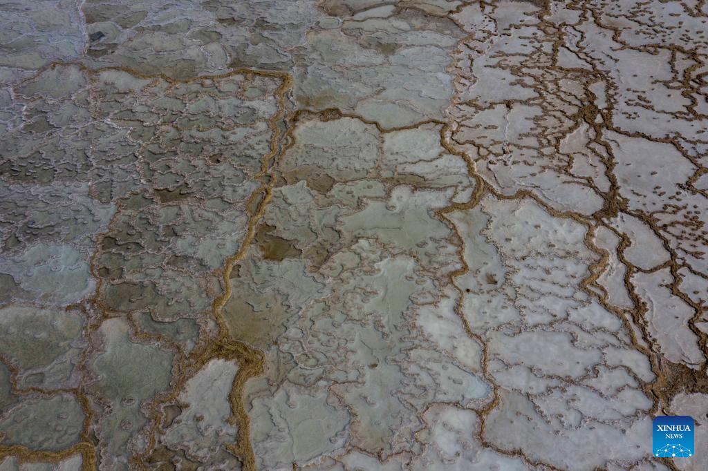 This aerial photo taken on June 20, 2023 shows salt formations in the northern part of the Dead Sea about 30 kilometers east of Jerusalem. The Dead Sea depends heavily on inflows from the Jordan River in the north to maintain its water level. In the past decades, farming and mineral extraction in the area are believed to have pulled out more water than can be refilled by natural means, posing ecological threats to the ever-shrinking salt lake.