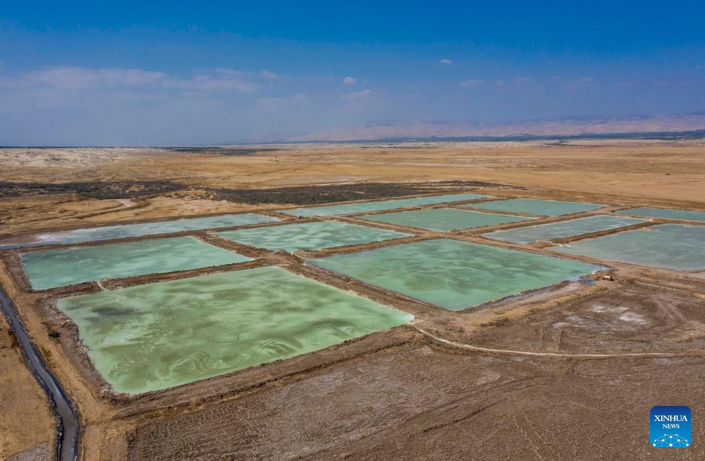 This aerial photo taken on June 20, 2023 shows the shore of the northern part of the Dead Sea about 30 kilometers east of Jerusalem. The Dead Sea depends heavily on inflows from the Jordan River in the north to maintain its water level. In the past decades, farming and mineral extraction in the area are believed to have pulled out more water than can be refilled by natural means, posing ecological threats to the ever-shrinking salt lake.