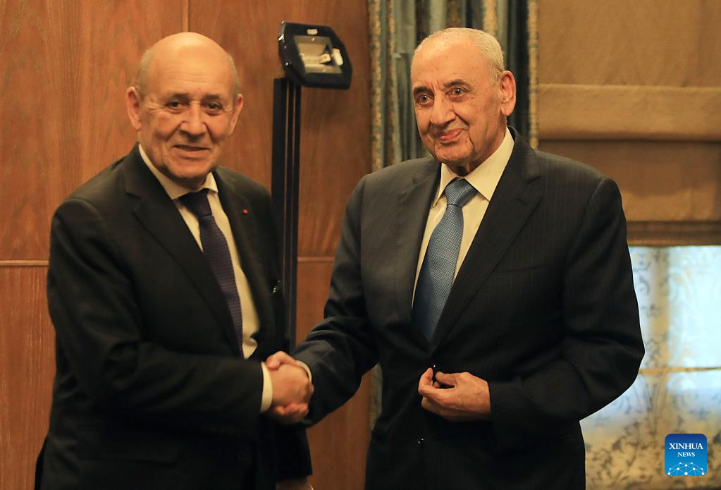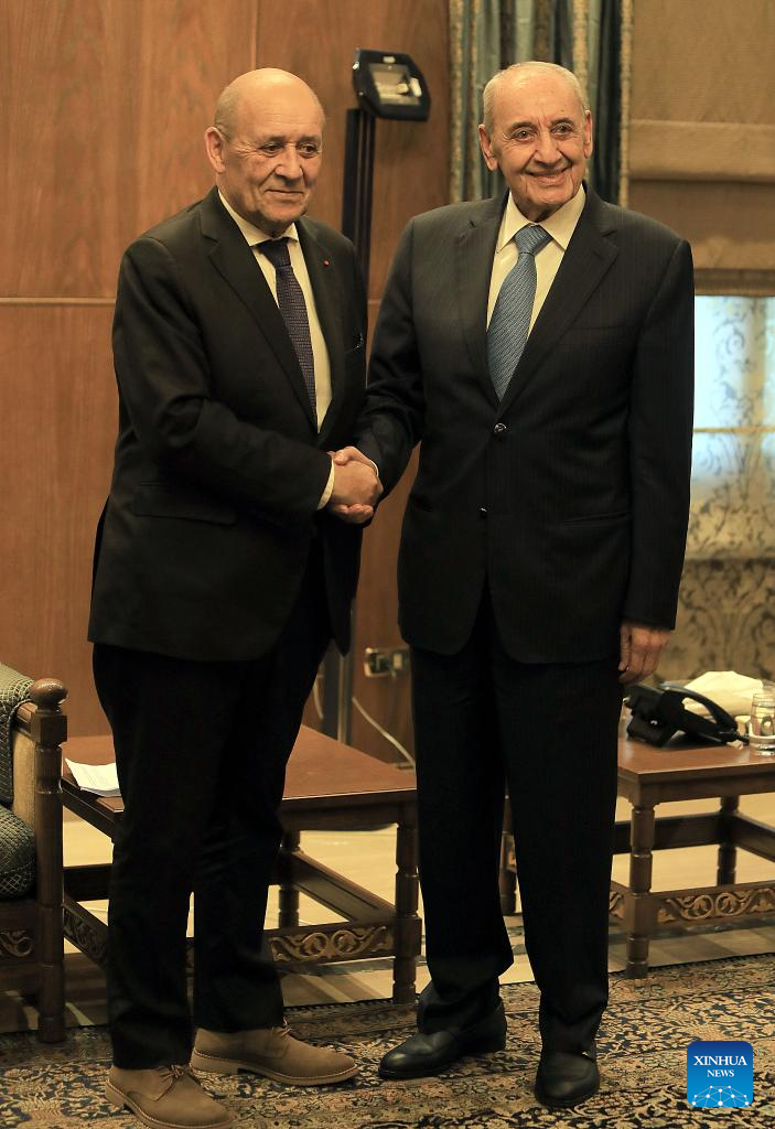 Lebanese Parliament Speaker Nabih Berri (R) receives France's special envoy for Lebanon Jean-Yves Le Drian in Beirut, Lebanon, on June 21, 2023. (Xinhua/Bilal Jawich)