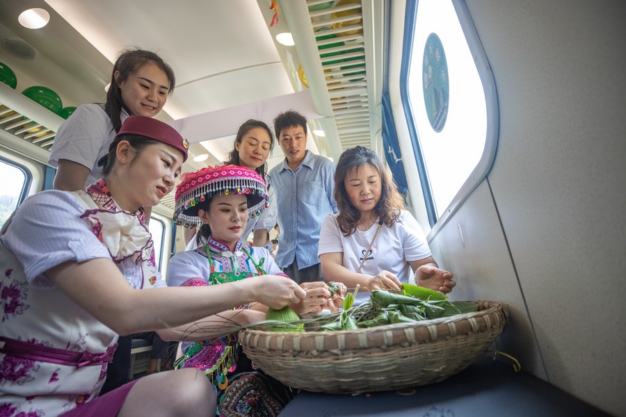 Volunteers make Zongzi with passengers on Train 5630 from Zunyi in Guizhou to Chongqing West in southwest China, June 20, 2023. (Xinhua/Huang Wei)