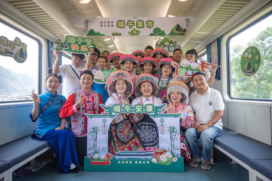 Chongqing, June 22 (Xinhua) -- As the Dragon Boat Festival holiday is coming, a special train carrying more than 300 passengers slowly left Zunyi Railway Station, heading for Chongqing West Railway Station on Tuesday. Different from the previous "slow train", passengers can not only enjoy the scenery along the way but also experience various Dragon Boat Festival folk customs during their journey.