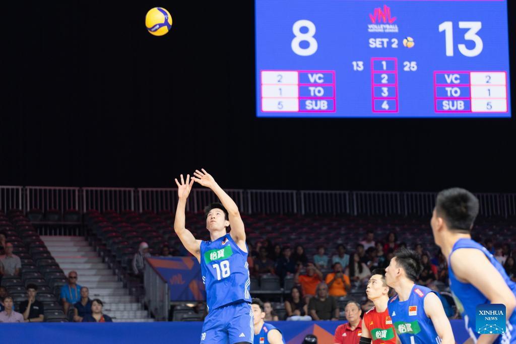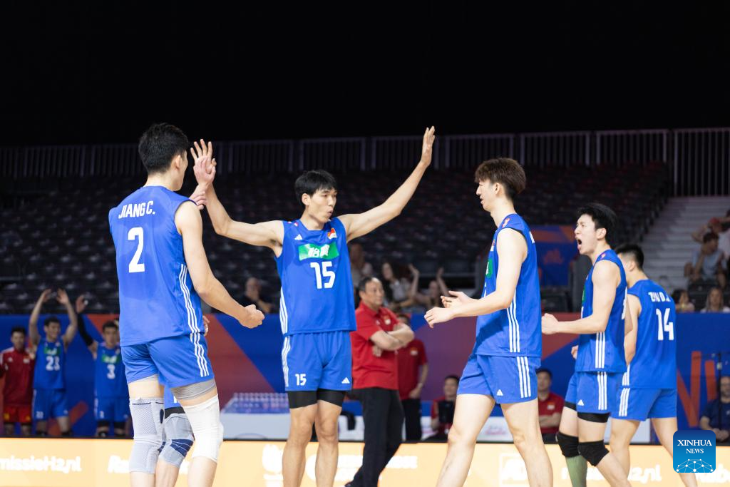 Chen Leiyang (1st L) of China competes during the 2023 Volleyball Nations League match between China and Italy in Rotterdam, the Netherlands, on June 22, 2023. (Photo by Sylvia Lederer/Xinhua)