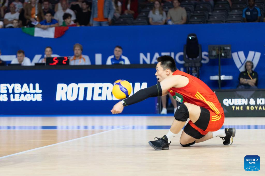 Yang Yiming of China saves the ball during the 2023 Volleyball Nations League match between China and Italy in Rotterdam, the Netherlands, on June 22, 2023. (Photo by Sylvia Lederer/Xinhua)