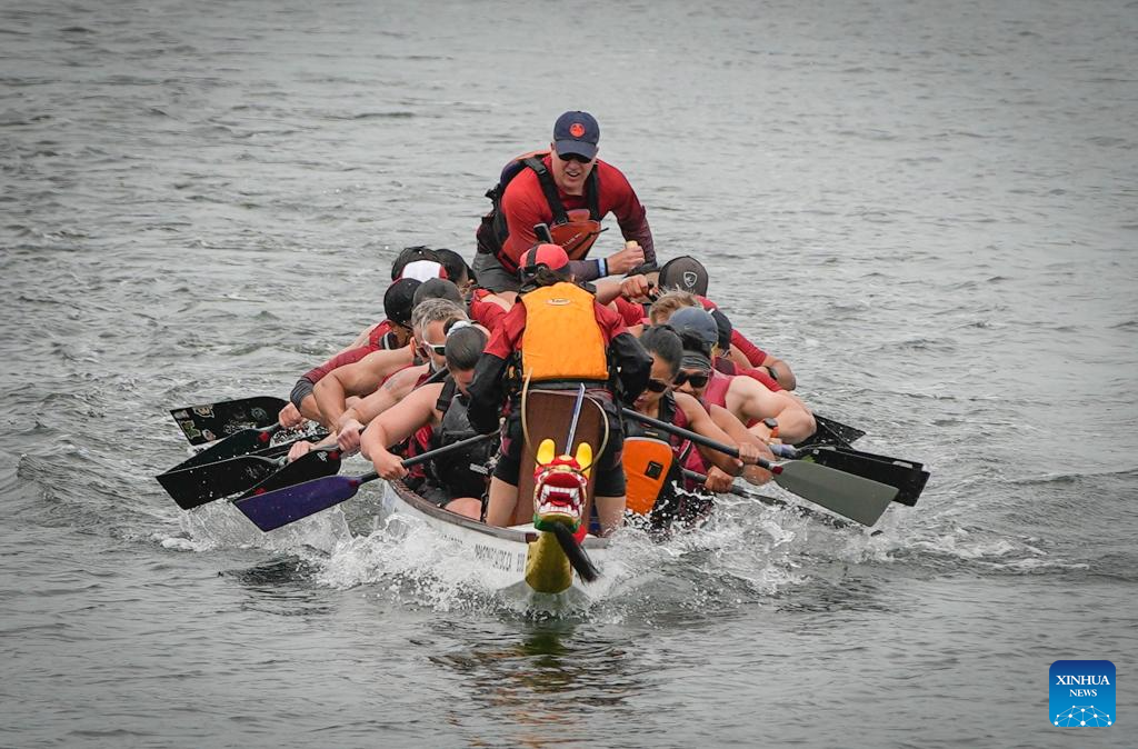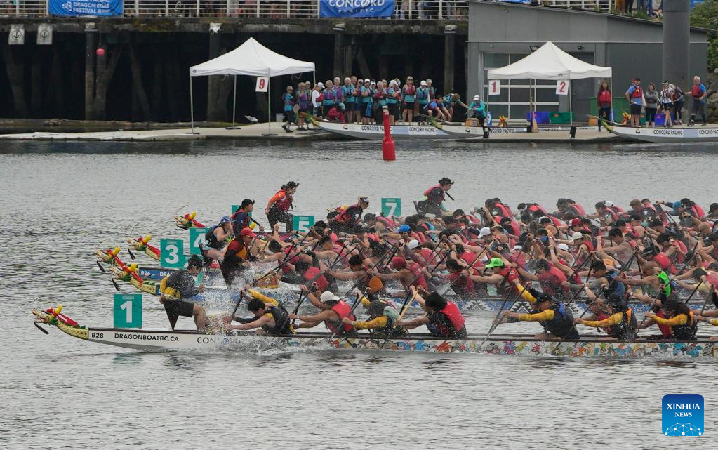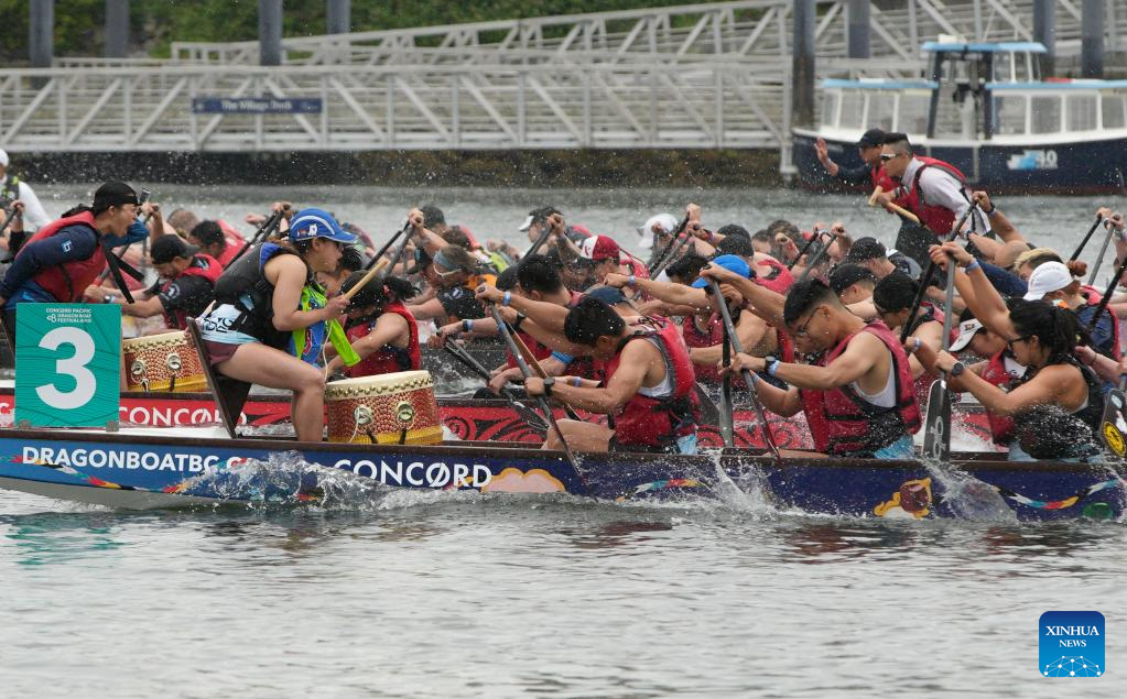 People participate in a dragon boat festival at False Creek in Vancouver, British Columbia, Canada, on June 24, 2023. (Photo by Liang Sen/Xinhua)