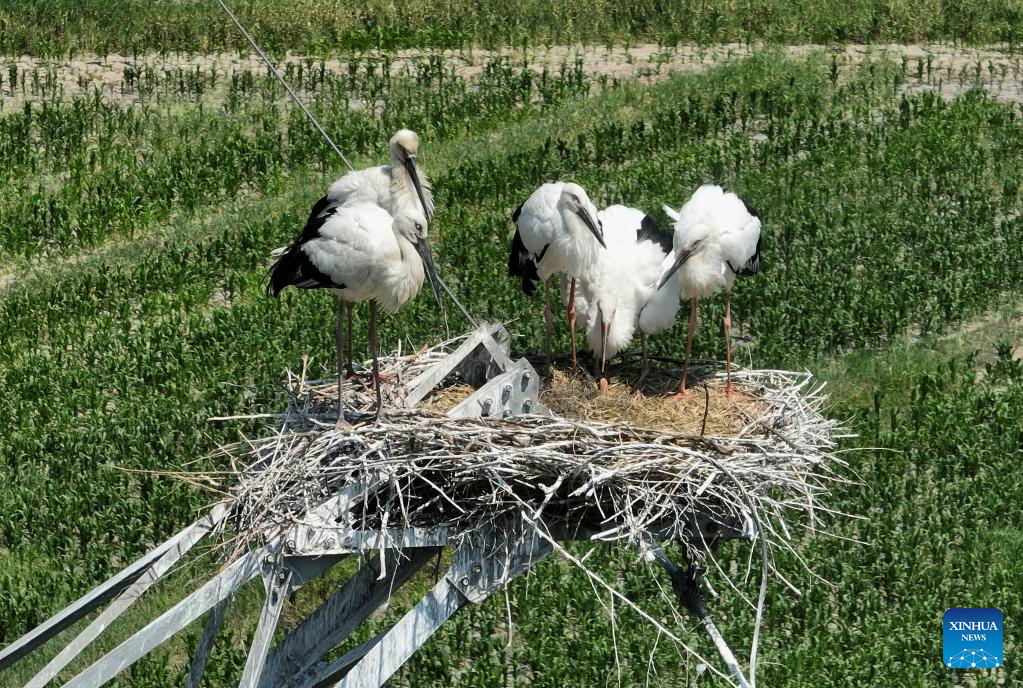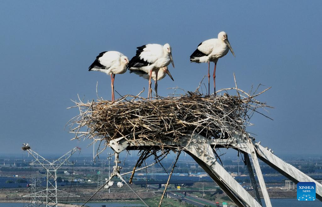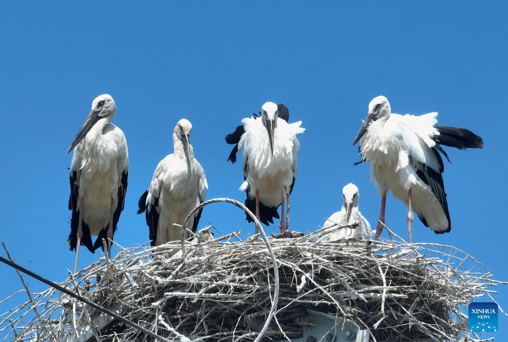 With efforts made by local authorities to repair the surrounding environment of the wetland in Heiyanzi Town, oriental white storks, a bird species under first-class national protection in China, now enjoy a larger area of habitat for living and breeding. (Xinhua/Yang Shiyao)