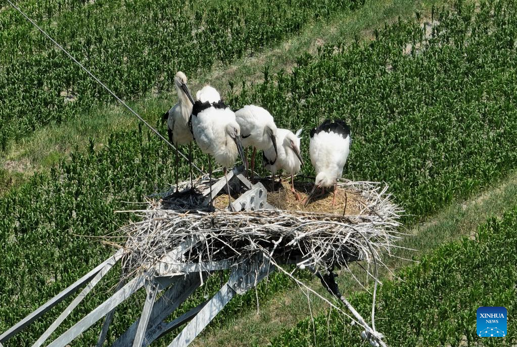 This photo taken with a drone on June 24, 2023 shows a full-grown oriental white stork (1st L, front) looking after its chicks in Heiyanzi Town of Fengnan District, Tangshan, north China's Hebei Province.