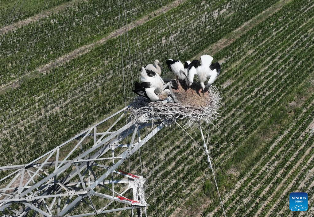 This photo taken with a drone on June 24, 2023 shows two full-grown oriental white storks (1st & 2nd L) looking after their chicks in Heiyanzi Town of Fengnan District, Tangshan, north China's Hebei Province.