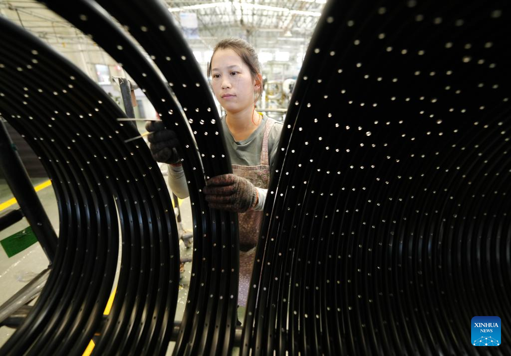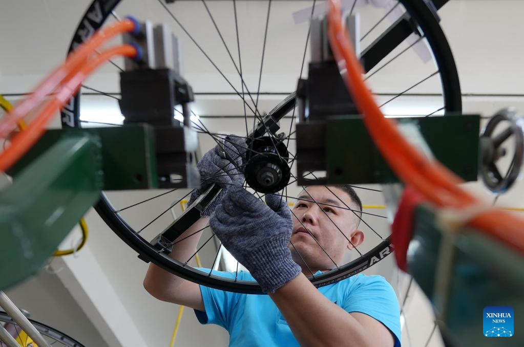 A staff member works at a workshop of a bicycle company in Lutai Economic Development Zone of Tangshan City, north China's Hebei Province, June 25, 2023. Lutai Economic Development Zone has upgraded its bicycle manufacturing sector and contributed to high-quality development in the regional economy in recent years. The annual output of the 46 bike-related enterprises in the zone has reached 5.5 billion yuan (about 761 million U.S. dollars). (Xinhua/Yang Shiyao)
