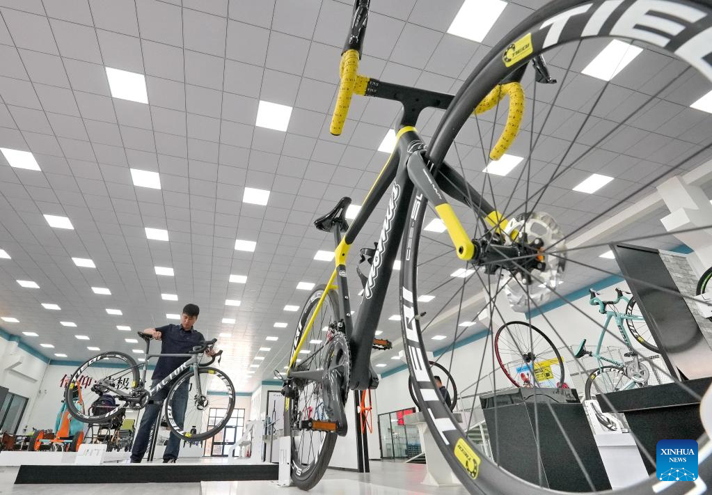 A staff member arranges exhibits at the exhibition hall of a bicycle company in Lutai Economic Development Zone of Tangshan City, north China's Hebei Province, June 25, 2023. Lutai Economic Development Zone has upgraded its bicycle manufacturing sector and contributed to high-quality development in the regional economy in recent years. The annual output of the 46 bike-related enterprises in the zone has reached 5.5 billion yuan (about 761 million U.S. dollars). (Xinhua/Yang Shiyao)