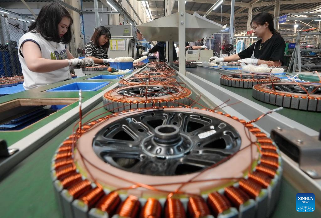 Staff members work at a workshop of an electric bicycle company in Lutai Economic Development Zone of Tangshan City, north China's Hebei Province, June 25, 2023. Lutai Economic Development Zone has upgraded its bicycle manufacturing sector and contributed to high-quality development in the regional economy in recent years. The annual output of the 46 bike-related enterprises in the zone has reached 5.5 billion yuan (about 761 million U.S. dollars). (Xinhua/Yang Shiyao)