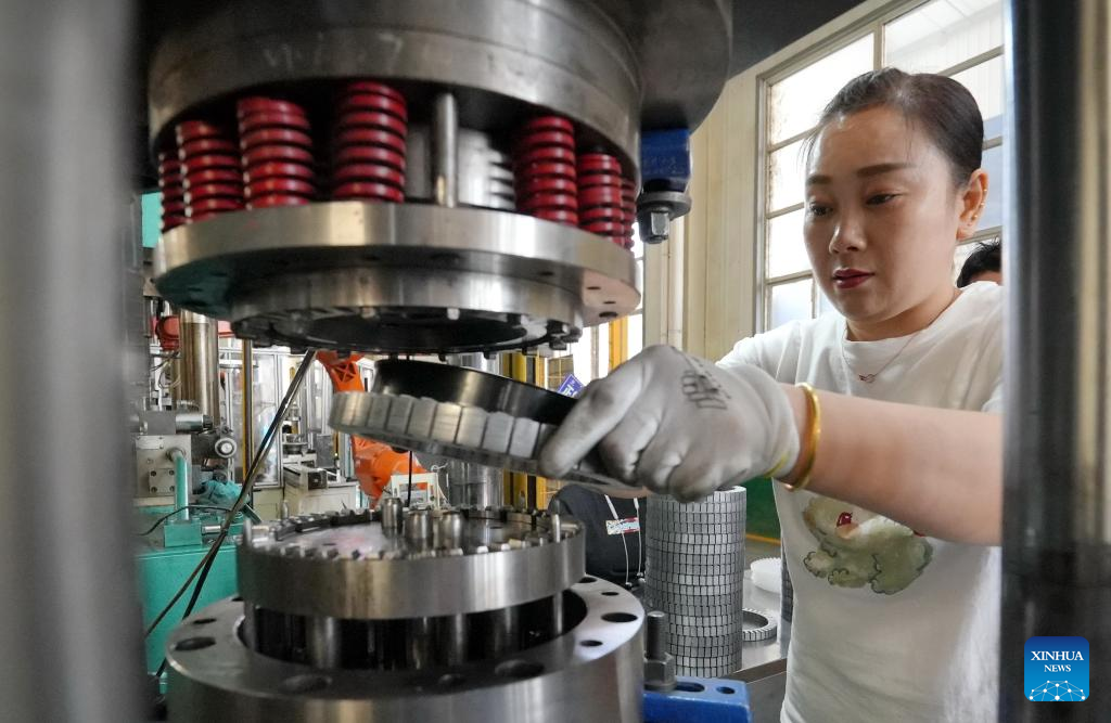 A staff member works at a workshop of a company producing bicycle components in Lutai Economic Development Zone of Tangshan City, north China's Hebei Province, June 25, 2023. Lutai Economic Development Zone has upgraded its bicycle manufacturing sector and contributed to high-quality development in the regional economy in recent years. The annual output of the 46 bike-related enterprises in the zone has reached 5.5 billion yuan (about 761 million U.S. dollars). (Xinhua/Yang Shiyao)
