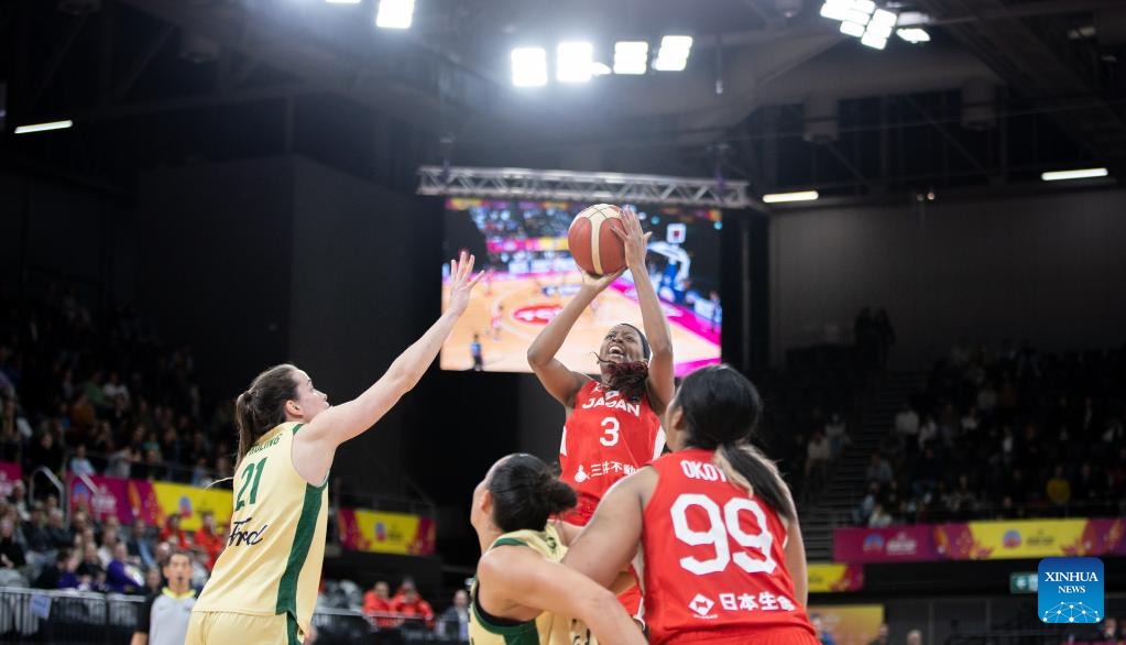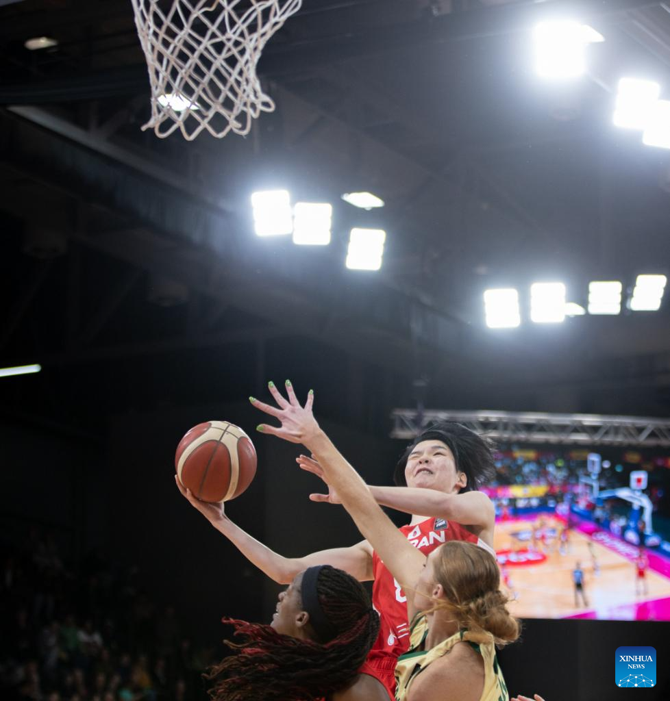 Stephanie Mawuli (top) of Japan shoots during the group B match against Australia at the 2023 FIBA Women's Asia Cup in Sydney, Australia, June 28, 2023. (Photo by Hu Jingchen/Xinhua)