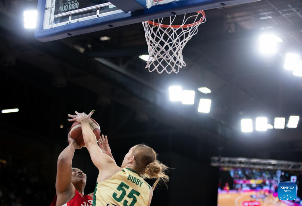 Chloe Louise Bibby (R) of Australia blocks Okoye Monica of Japan during their group B match at the 2023 FIBA Women's Asia Cup in Sydney, Australia, June 28, 2023. (Photo by Hu Jingchen/Xinhua)
