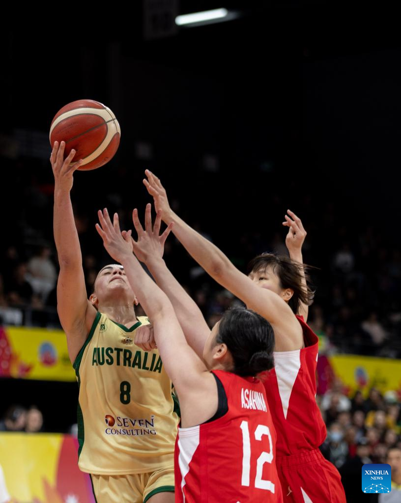 Maddison Louise Rocci (L) of Australia goes for a layup during the group B match against Japan at the 2023 FIBA Women's Asia Cup in Sydney, Australia, June 28, 2023. (Photo by Hu Jingchen/Xinhua)