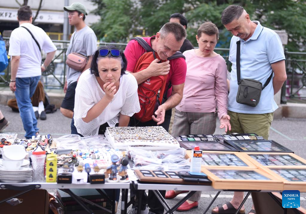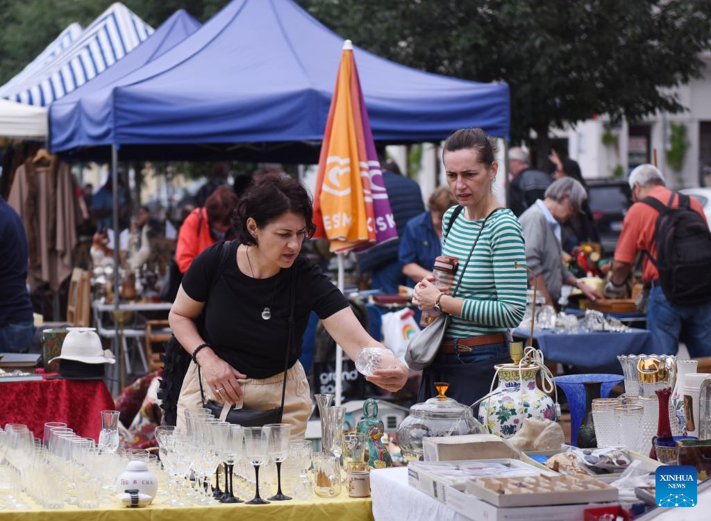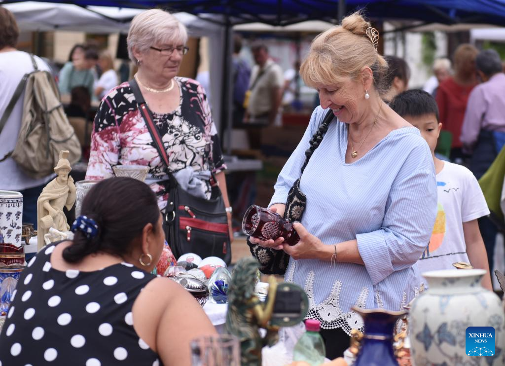 A customer selects goods at a flea market of Naschmarkt in Vienna, Austria, July 1, 2023. (Xinhua/He Canling)