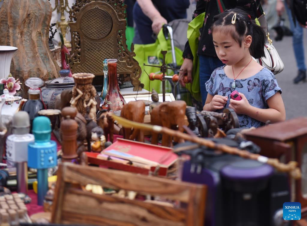 A girl selects goods at a flea market of Naschmarkt in Vienna, Austria, July 1, 2023. (Xinhua/He Canling)