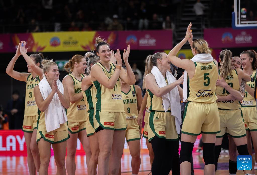 Players of Australia celebrate after winning the 3rd place match between Australia and New Zealand at the 2023 FIBA Women's Asia Cup in Sydney, Australia, July 2, 2023. (Photo by Hu Jingchen/Xinhua)