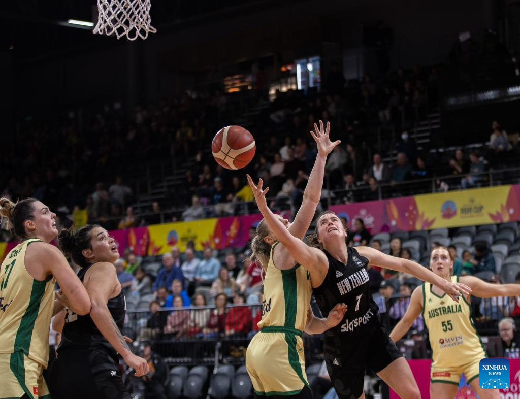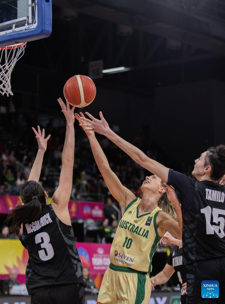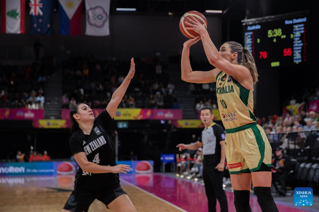 Alice Kunek (R) of Australia shoots during the 3rd place match between Australia and New Zealand at the 2023 FIBA Women's Asia Cup in Sydney, Australia, July 2, 2023. (Photo by Hu Jingchen/Xinhua)