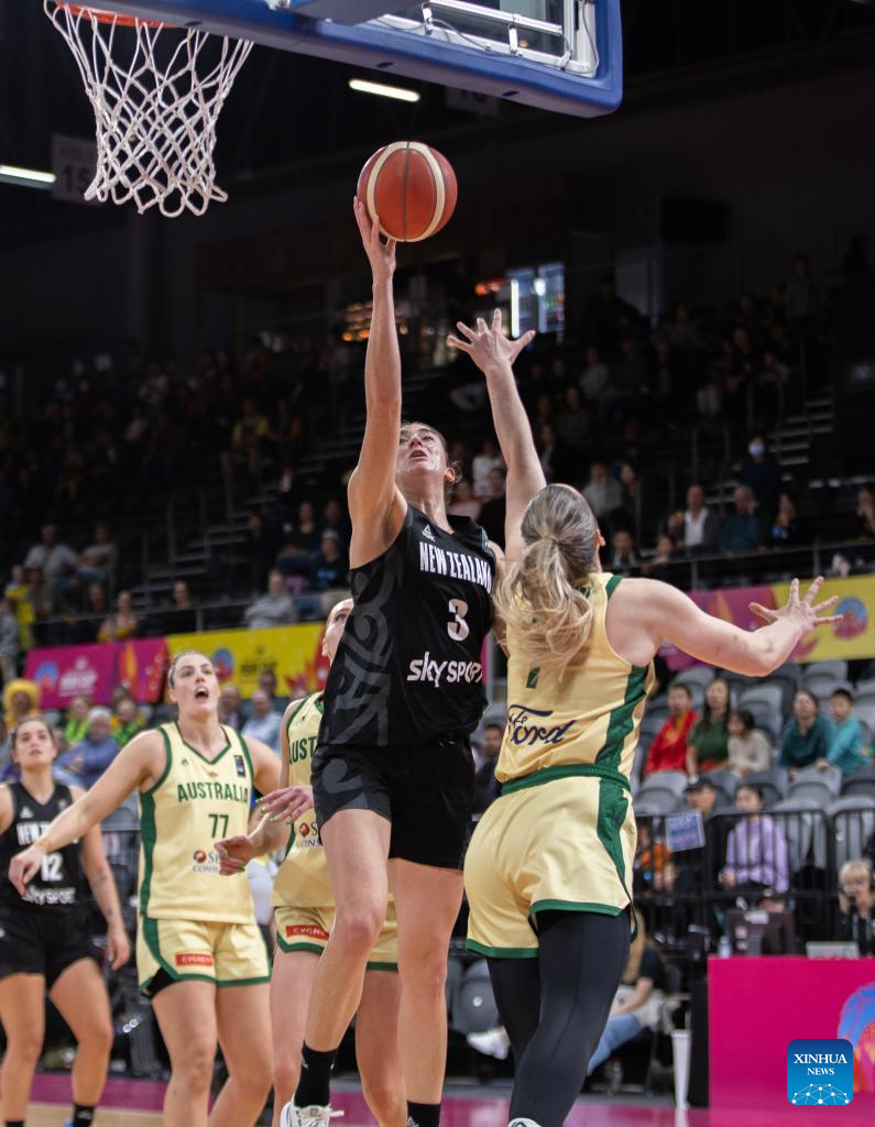 Stella Beck (2nd R) of New Zealand goes for a lay-up during the 3rd place match between Australia and New Zealand at the 2023 FIBA Women's Asia Cup in Sydney, Australia, July 2, 2023. (Photo by Hu Jingchen/Xinhua)