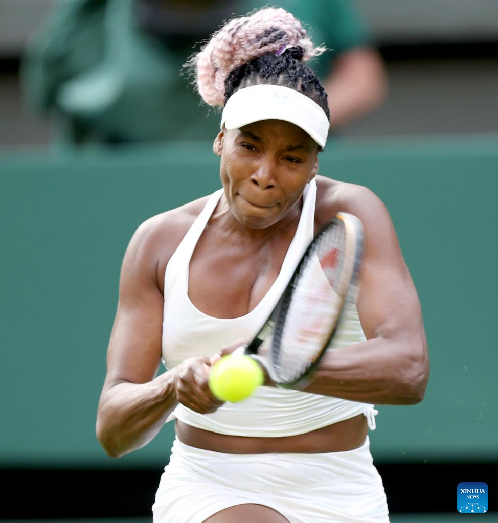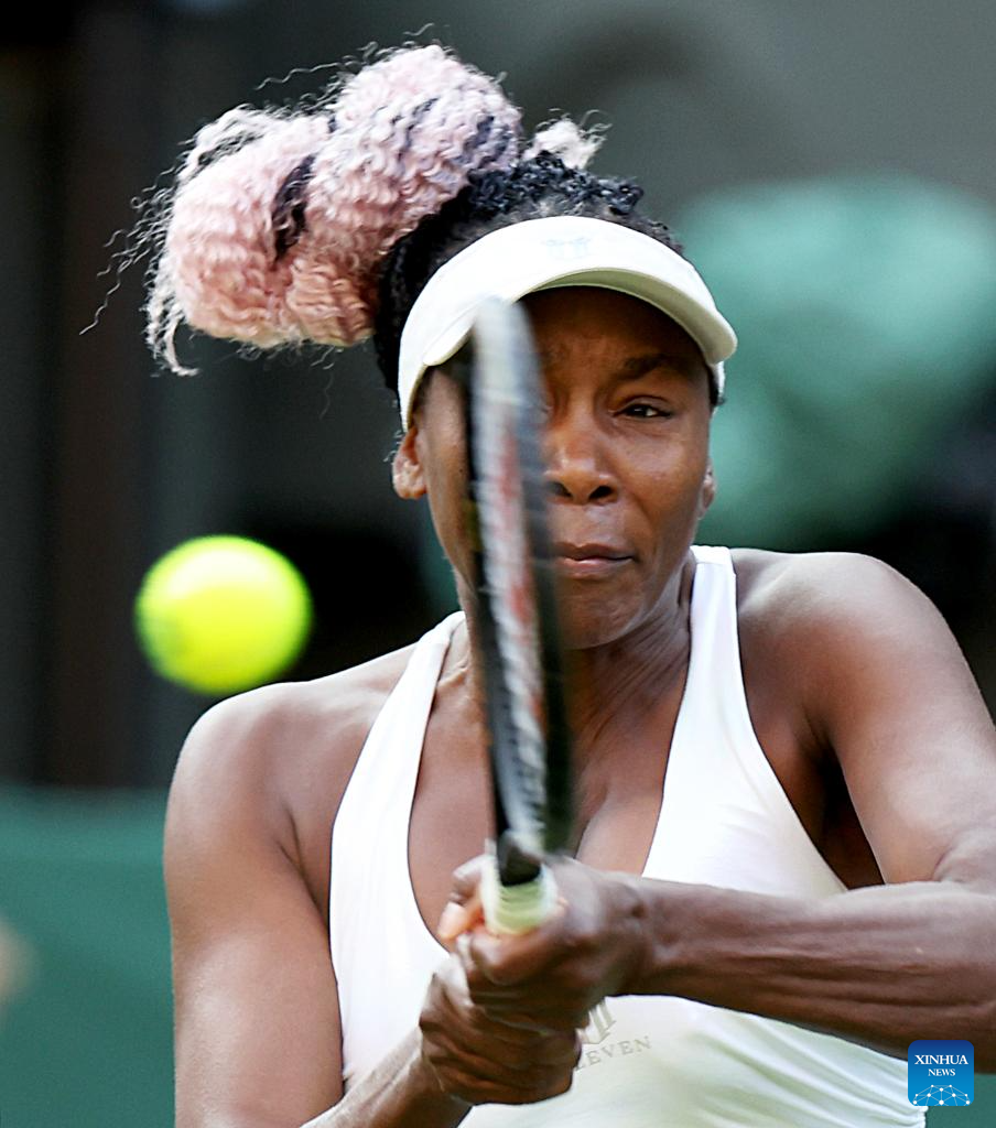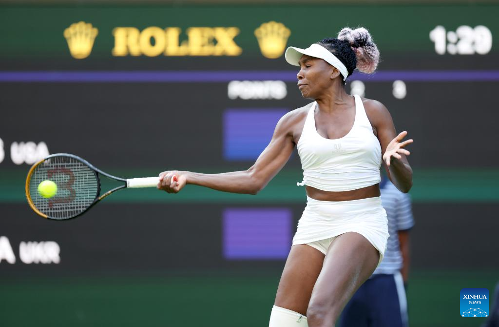 Venus Williams of the United States returns a shot during the women's singles first round match against Elina Svitolina of Ukraine at Wimbledon Tennis Championship in London, Britain, on July 3, 2023. (Xinhua/Li Ying)