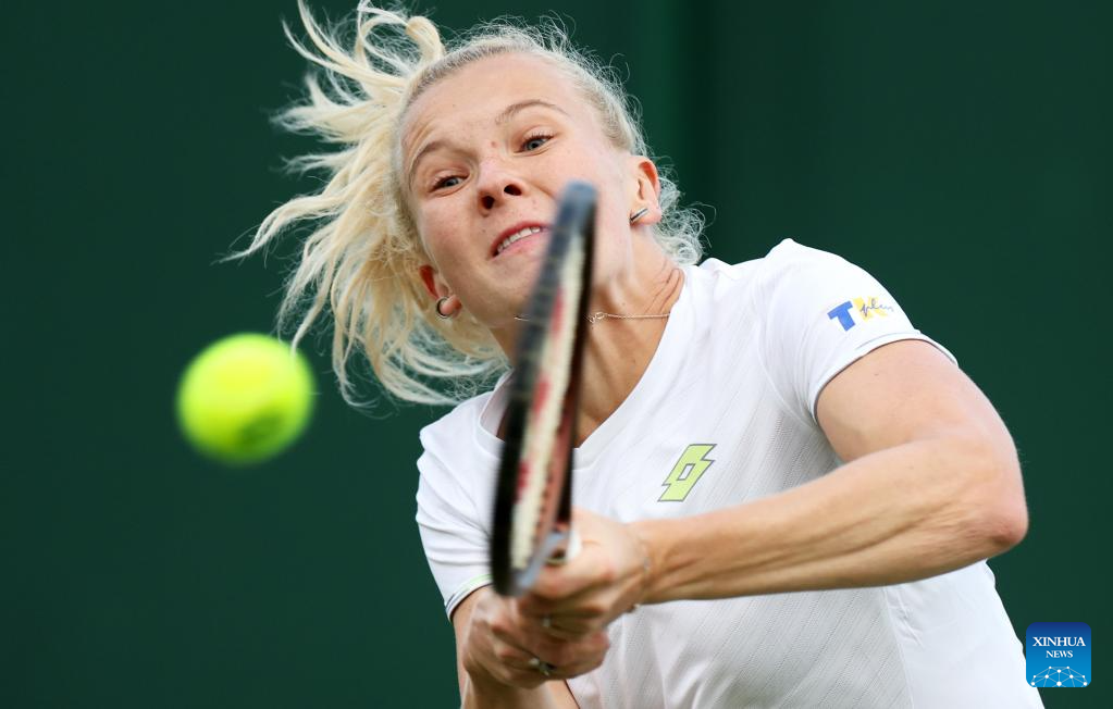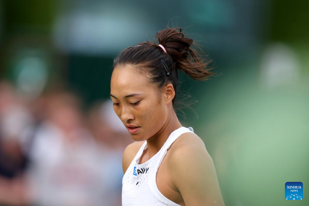 Zhu Lin of China competes during the women's singles 1st round match against Iga Swiatek of Poland at Wimbledon Tennis Championship in London, Britain, on July 3, 2023. (Xinhua/Han Yan)