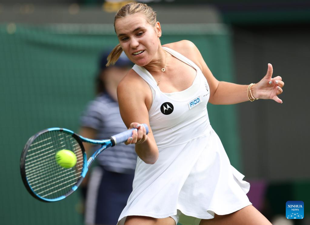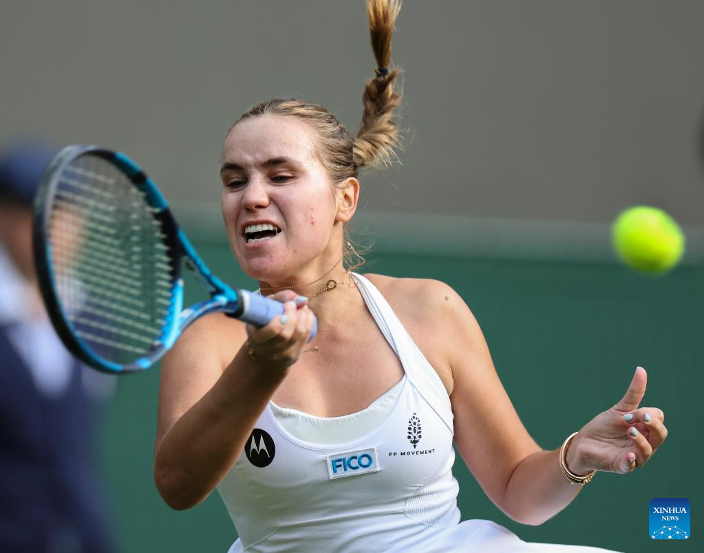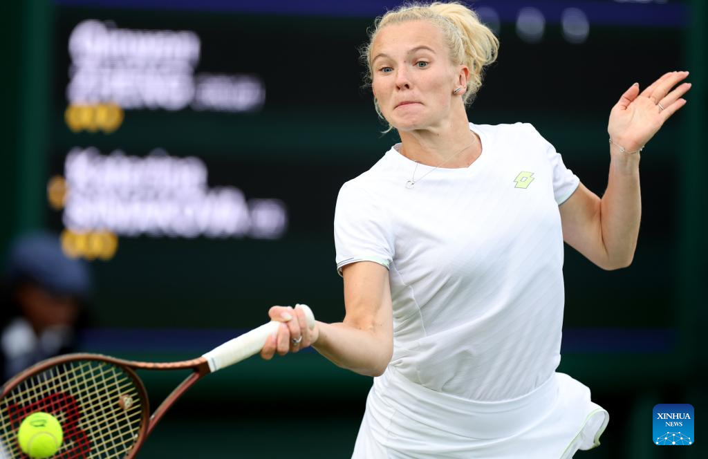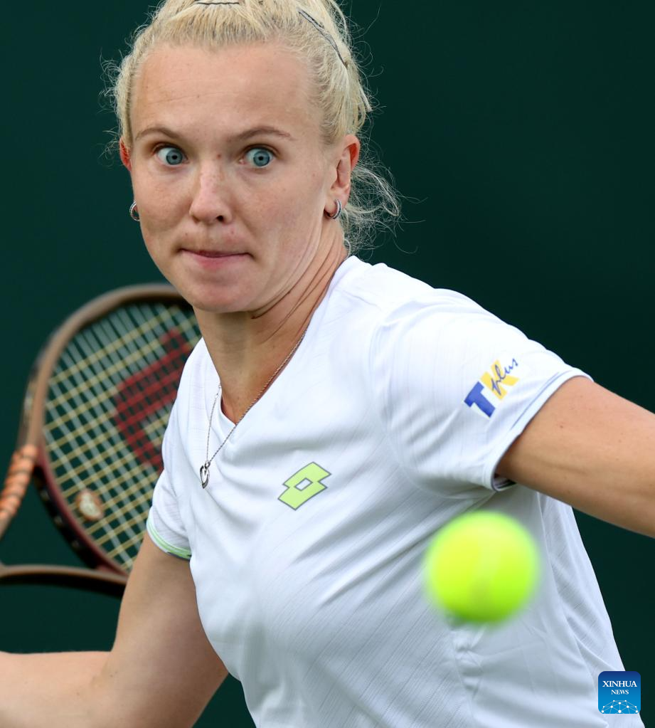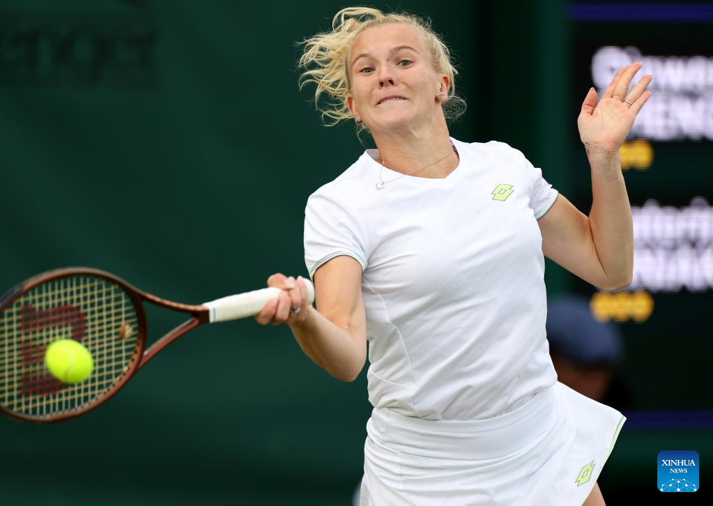 Katerina Siniakova of the Czech Republic returns a shot during the women's singles first round match against Zheng Qinwen of China at Wimbledon Tennis Championship in London, Britain, on July 3, 2023. (Xinhua/Li Ying)