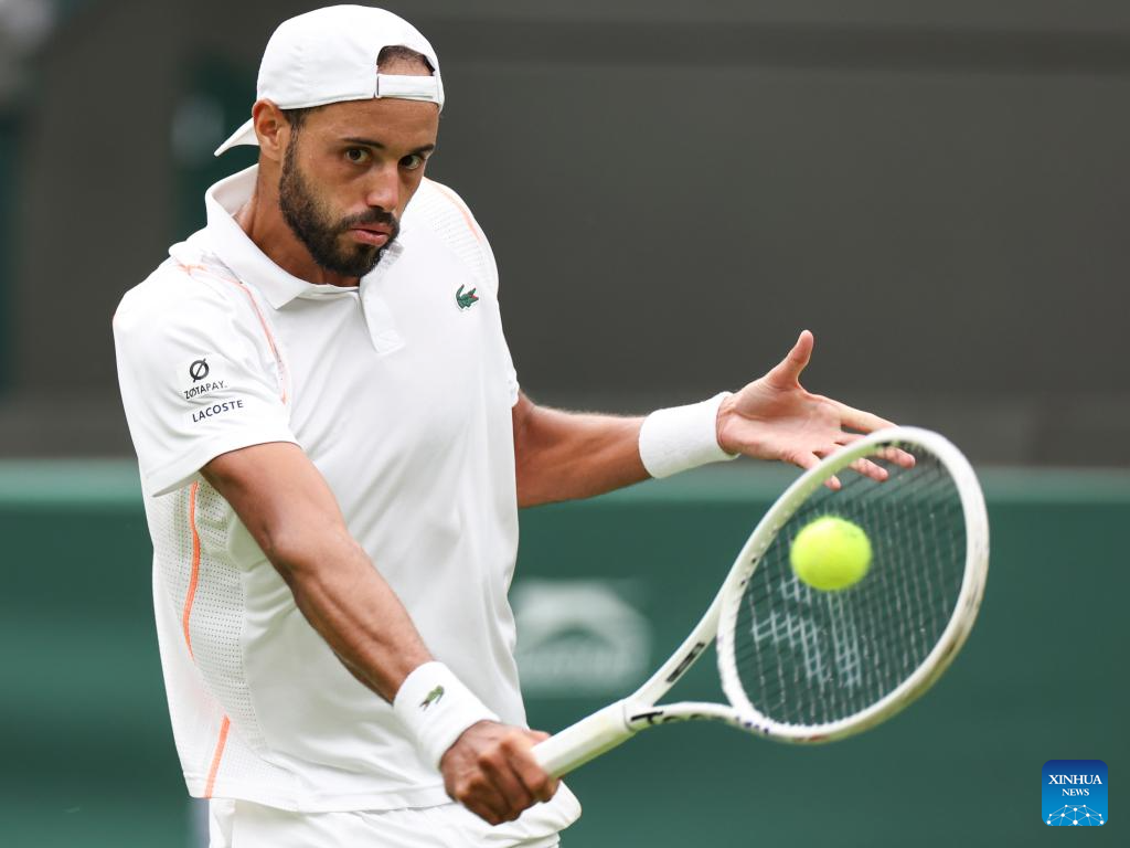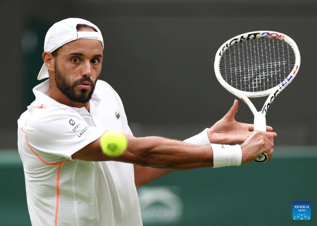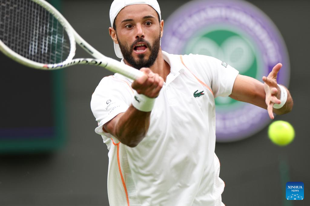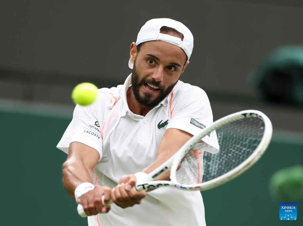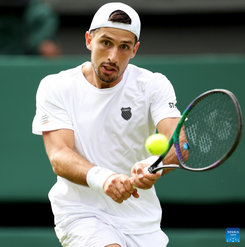 Pedro Cachin of Argentina returns a shot during the men's singles 1st round match against Novak Djokovic of Serbia at Wimbledon Tennis Championship in London, Britain, on July 3, 2023. (Xinhua/Li Ying)