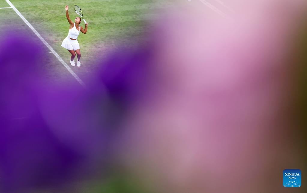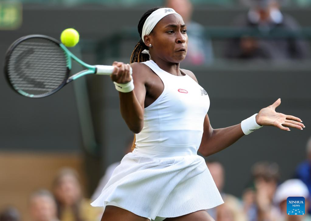 Coco Gauff of the United States returns a shot during the women's singles first round match against Sofia Kenin of the United States at Wimbledon Tennis Championship in London, Britain, on July 3, 2023. (Xinhua/Han Yan)