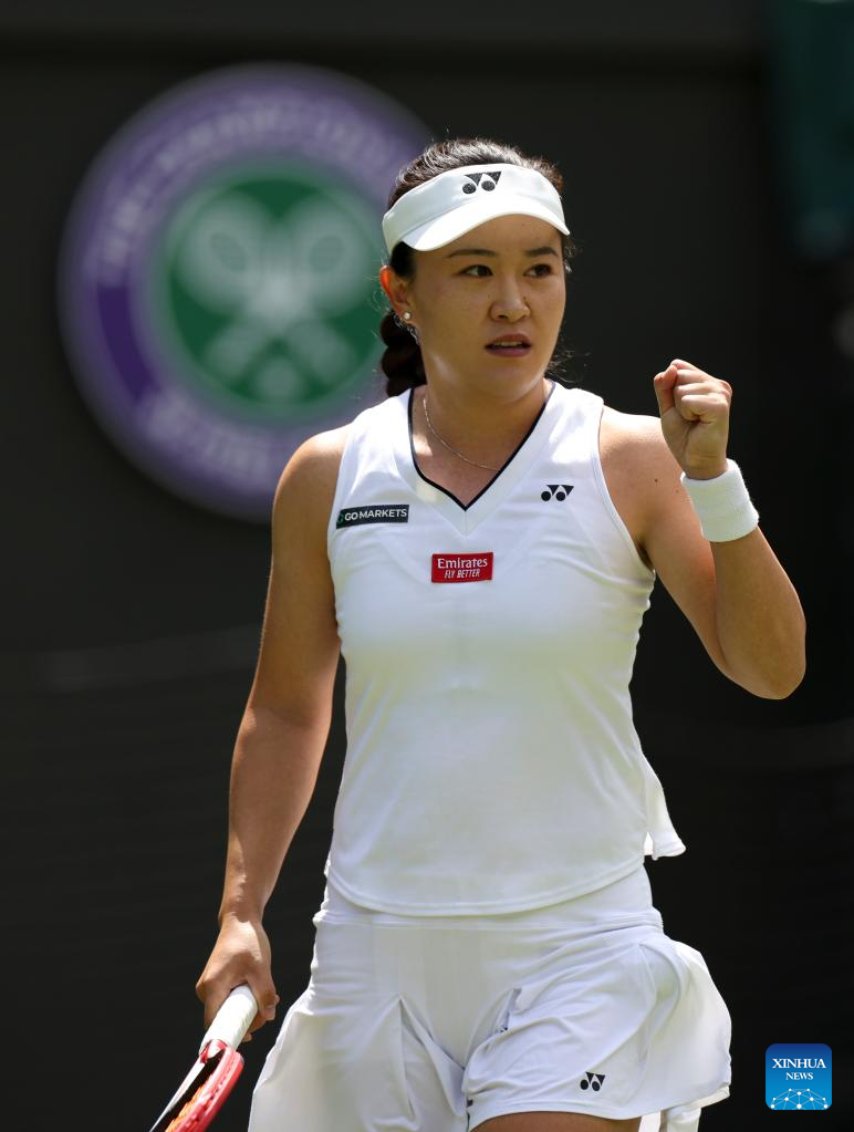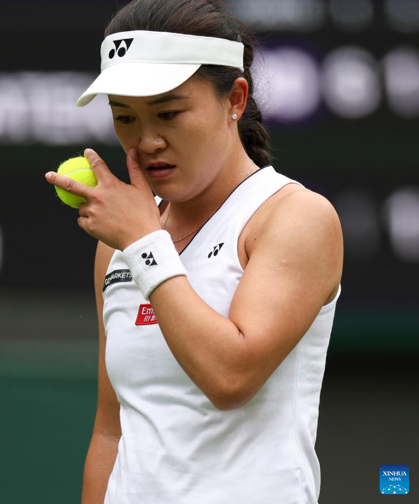 Yuan Yue of China competes during the women's singles 1st round match against Victoria Azarenka of Belarus at Wimbledon Tennis Championship in London, Britain, on July 3, 2023. (Xinhua/Li Ying)