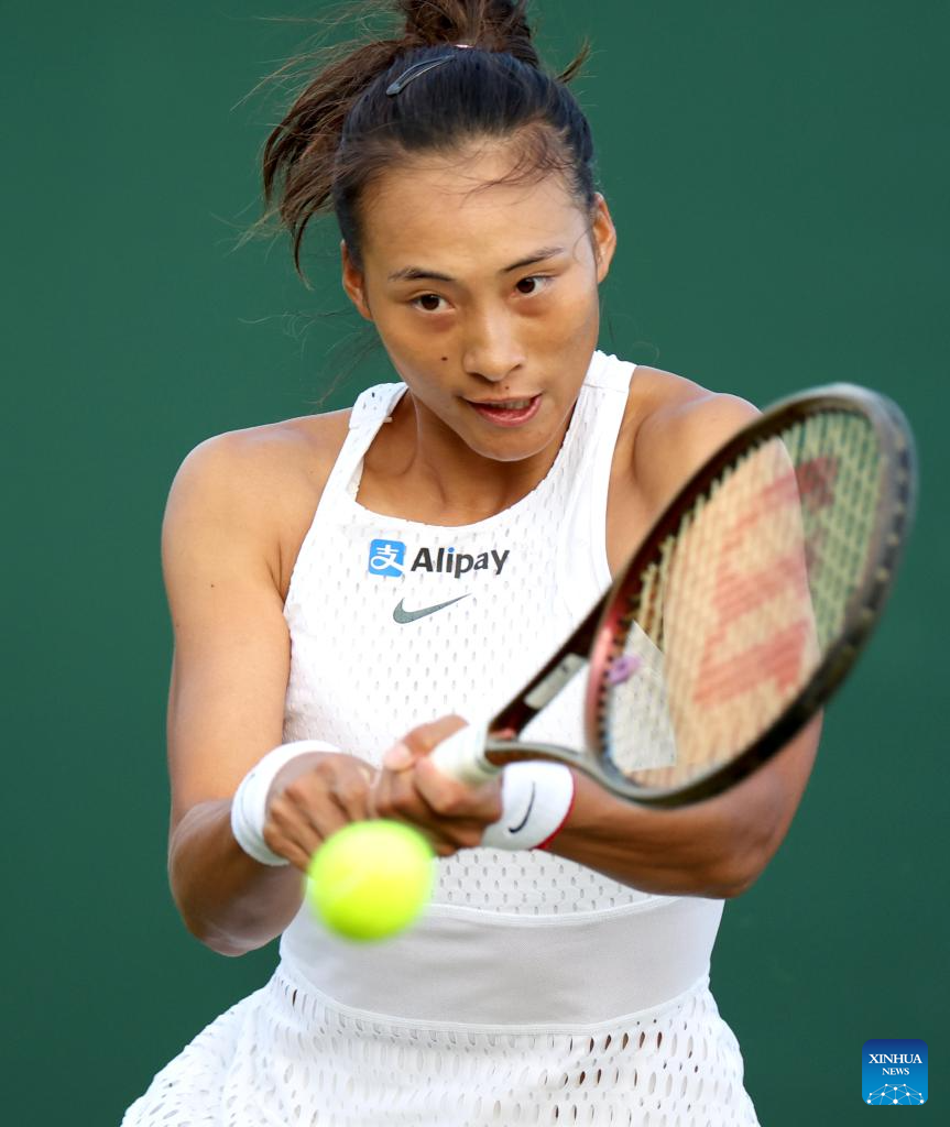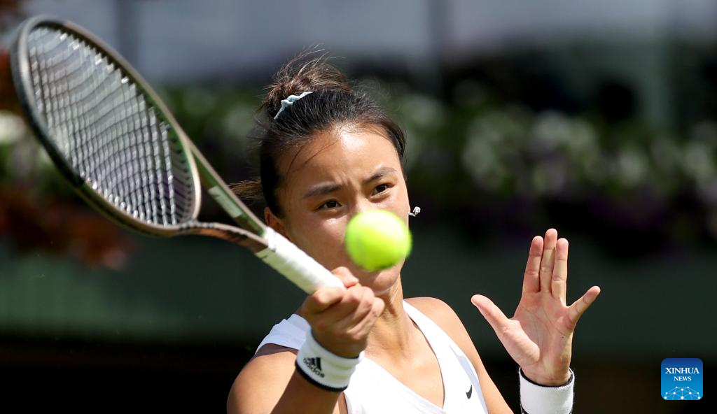 Zheng Qinwen of China returns a shot during the women's singles first round match against Katerina Siniakova of the Czech Republic at Wimbledon Tennis Championship in London, Britain, on July 3, 2023. (Xinhua/Li Ying)