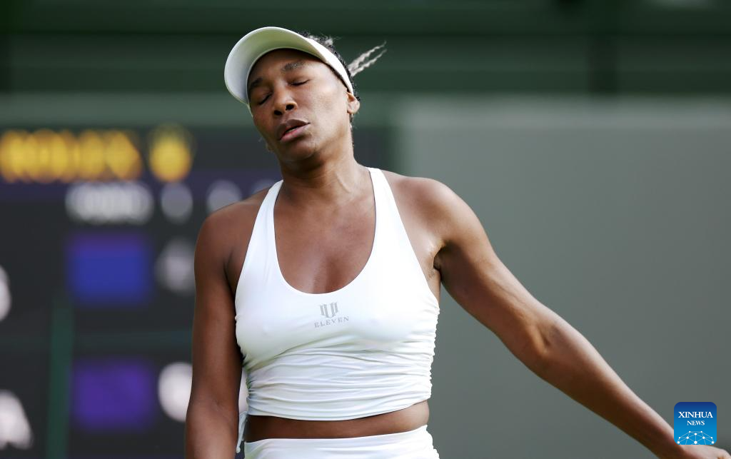 Venus Williams of the United States reacts during the women's singles first round match against Elina Svitolina of Ukraine at Wimbledon Tennis Championship in London, Britain, on July 3, 2023. (Xinhua/Li Ying)