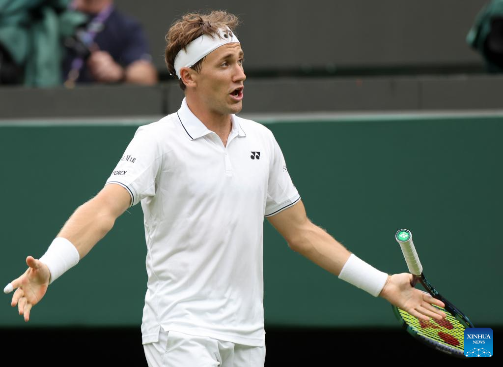 Casper Ruud of Norway reacts during the men's singles first round match against Laurent Lokoli of France at Wimbledon Tennis Championship in London, Britain, on July 3, 2023. (Xinhua/Han Yan)