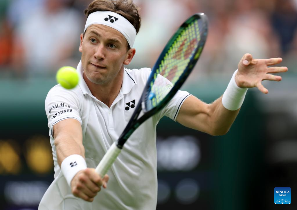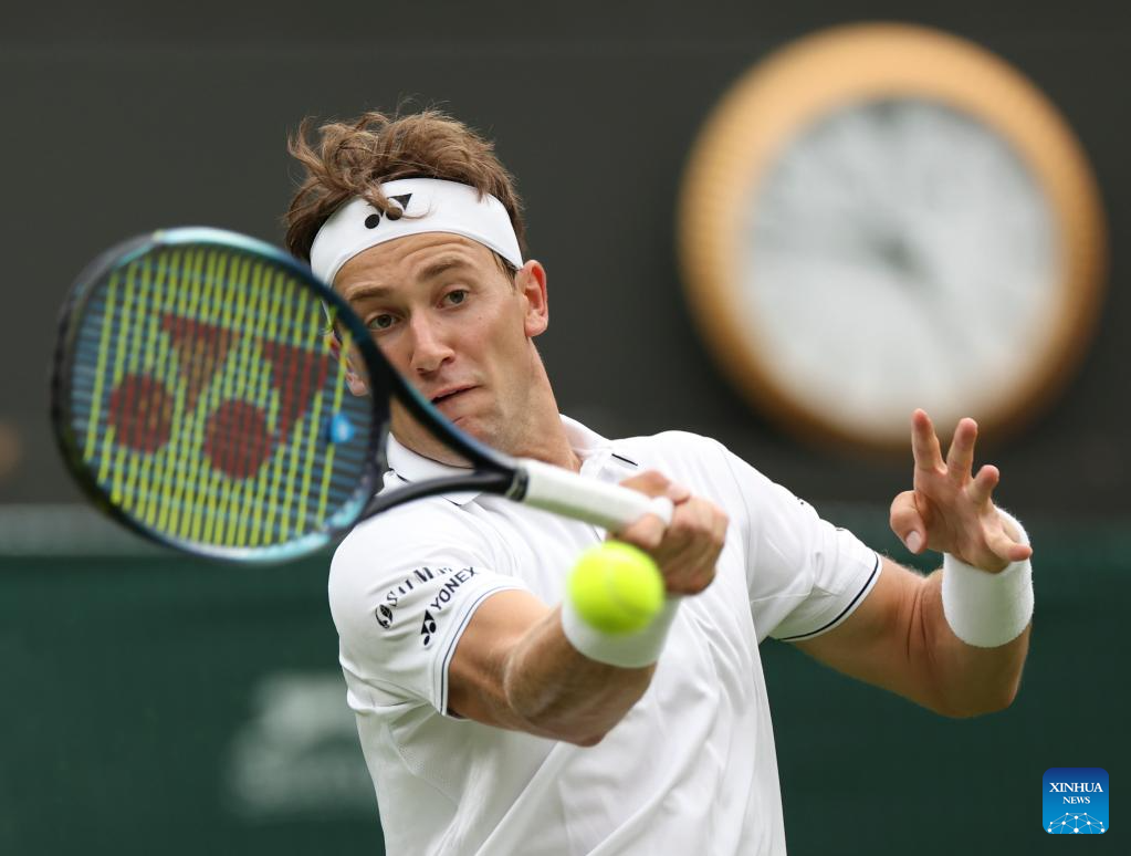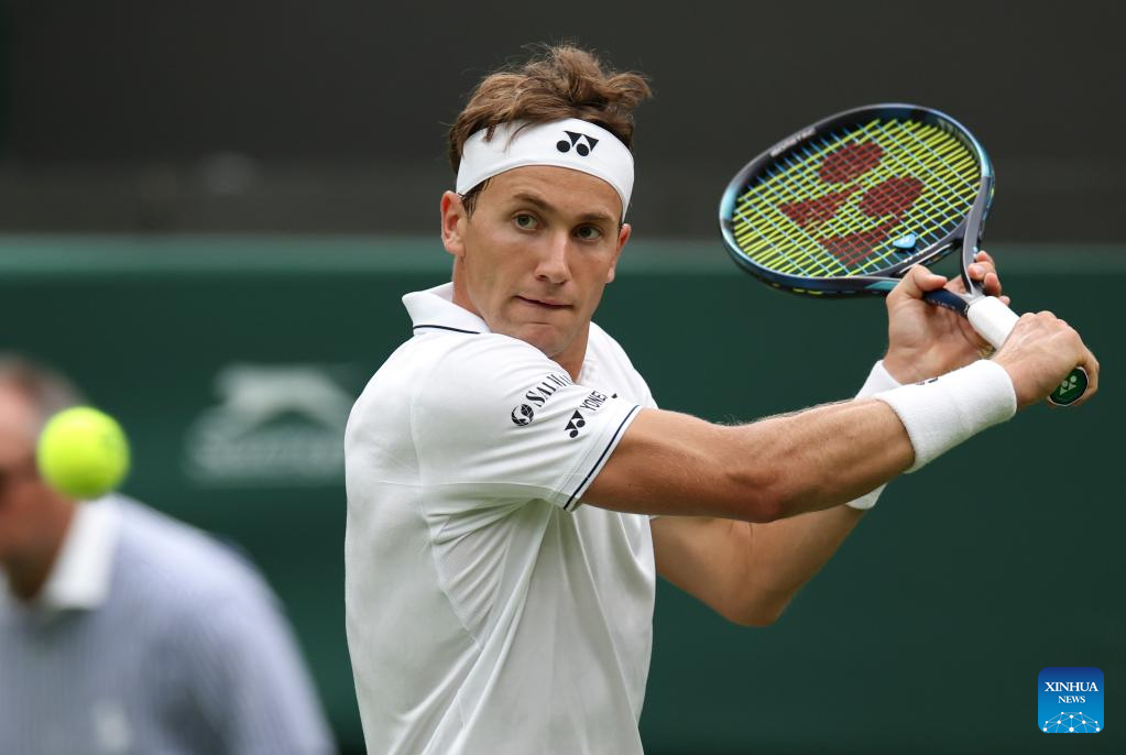Casper Ruud of Norway returns a shot during the men's singles first round match against Laurent Lokoli of France at Wimbledon Tennis Championship in London, Britain, on July 3, 2023. (Xinhua/Han Yan)