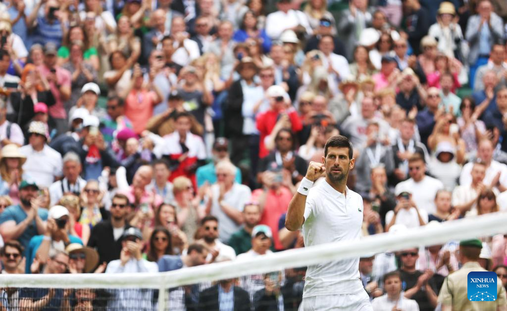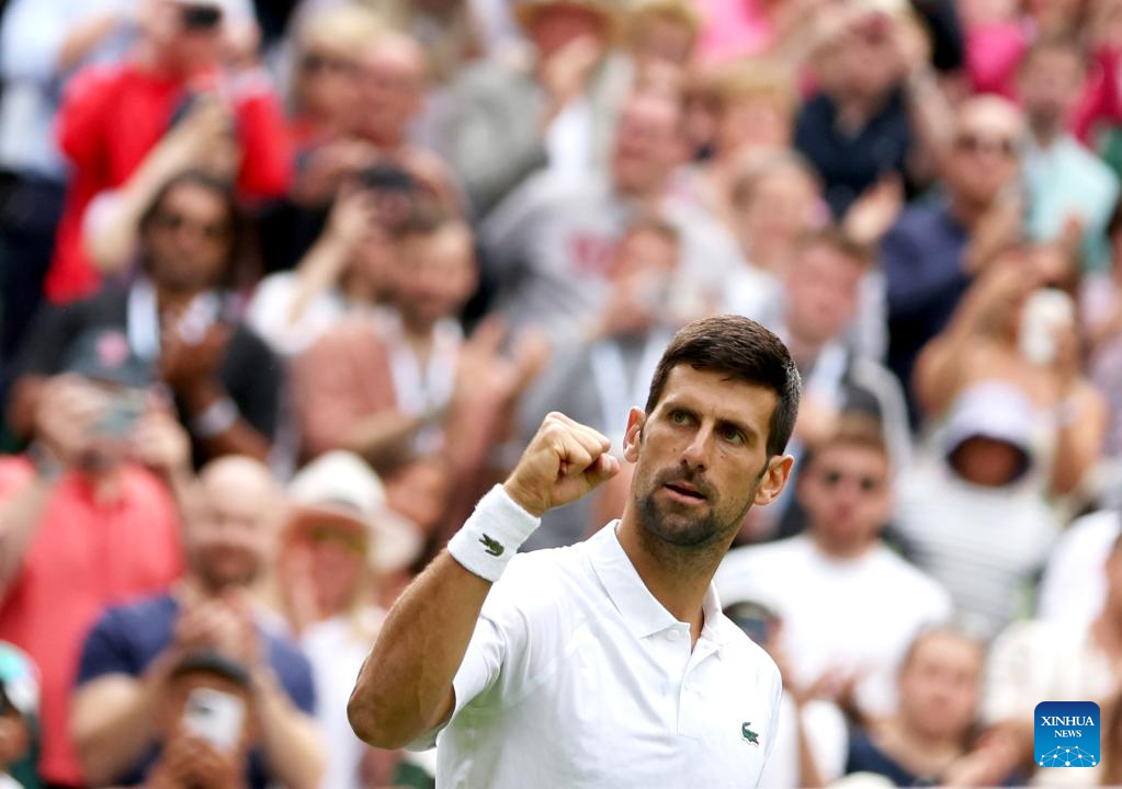 Novak Djokovic of Serbia celebrates after the men's singles 1st round match against Pedro Cachin of Argentina at Wimbledon Tennis Championship in London, Britain, on July 3, 2023. (Xinhua/Li Ying)