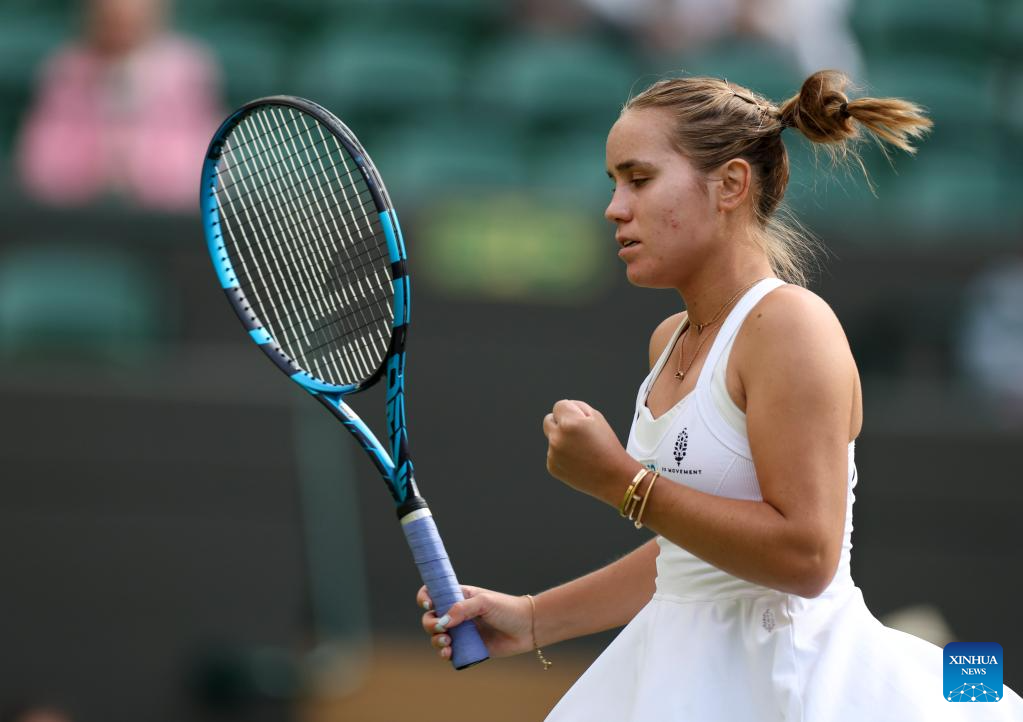 Sofia Kenin of the United States celebrates during the women's singles first round match against Coco Gauff of the United States at Wimbledon Tennis Championship in London, Britain, on July 3, 2023. (Xinhua/Han Yan)