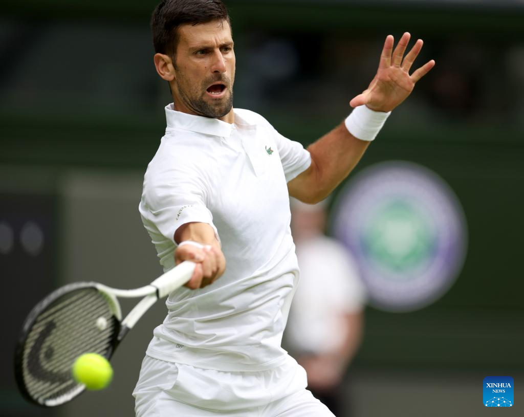 Novak Djokovic of Serbia returns a shot during the men's singles 1st round match against Pedro Cachin of Argentina at Wimbledon Tennis Championship in London, Britain, on July 3, 2023. (Xinhua/Li Ying)